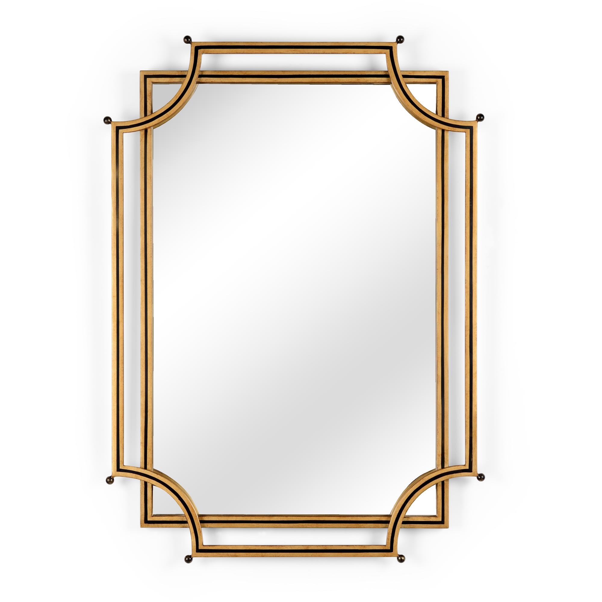 London Church Mirror features two metal frames stacked to give added dimension to this modern design. The bottom frame is a rectangular shaped gold frame with a black accent that houses a plain mirror. The top frame is a larger rectangular frame with rounded cut out corners and black accents. This unique 45″ wall mirror comes ready to hang in your home. Bradshaw Orrell design
