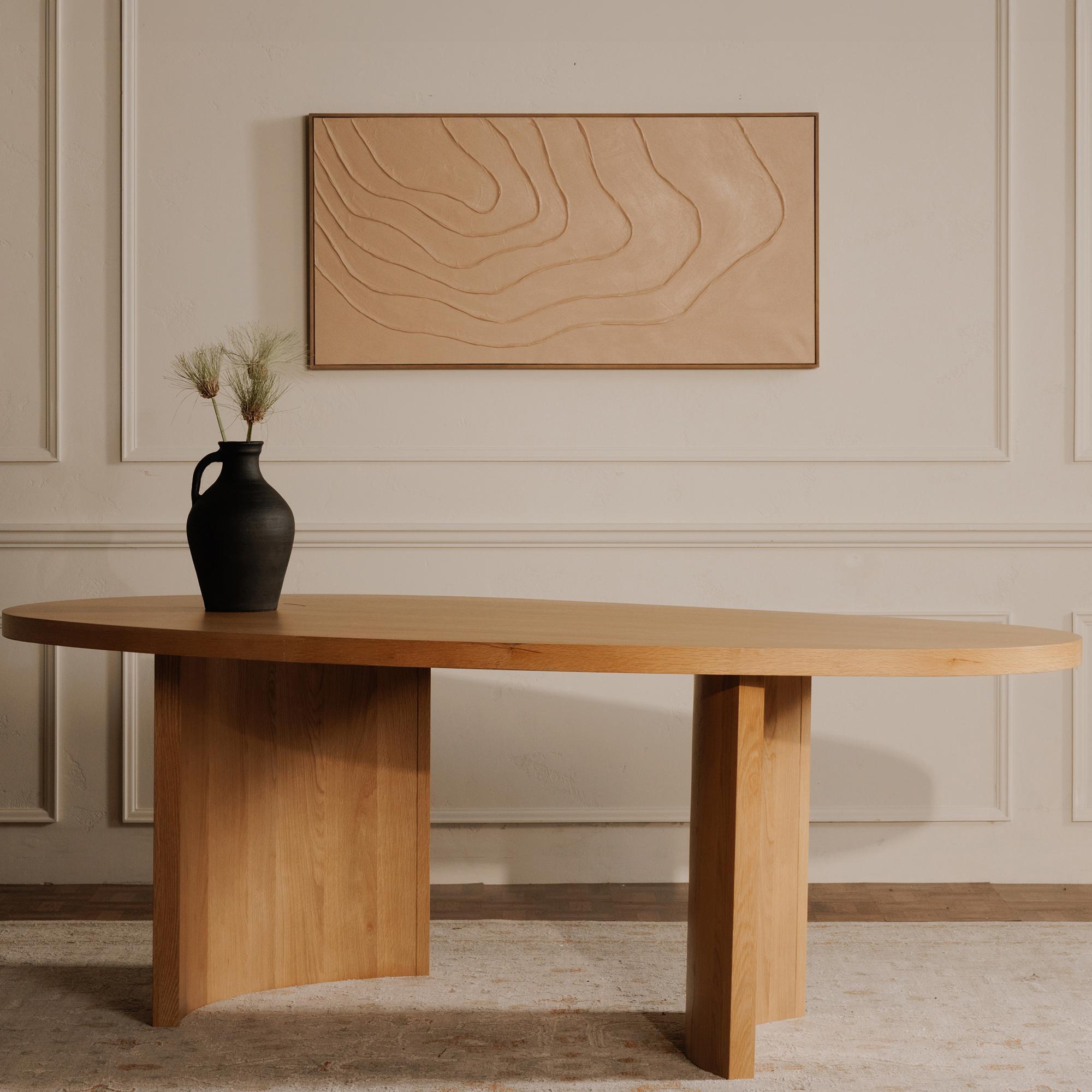 Infused with the serene beauty of nature, the Louise dining table’s freeform design takes inspiration from the organic contours of a tranquil pond. With one gently rotating away from the other, the simplicity of the curved bases echoes the fluidity of natural landscapes. Finished in warm natural oak veneer, the table introduces a balanced and organic touch to various interior styles.