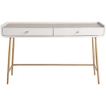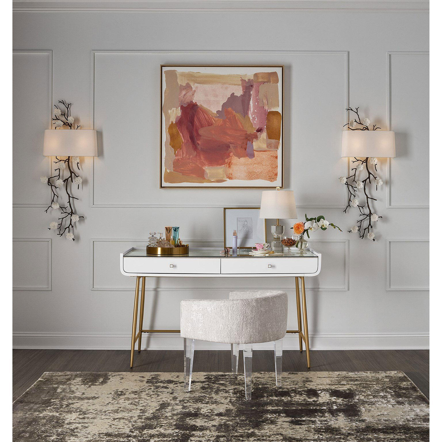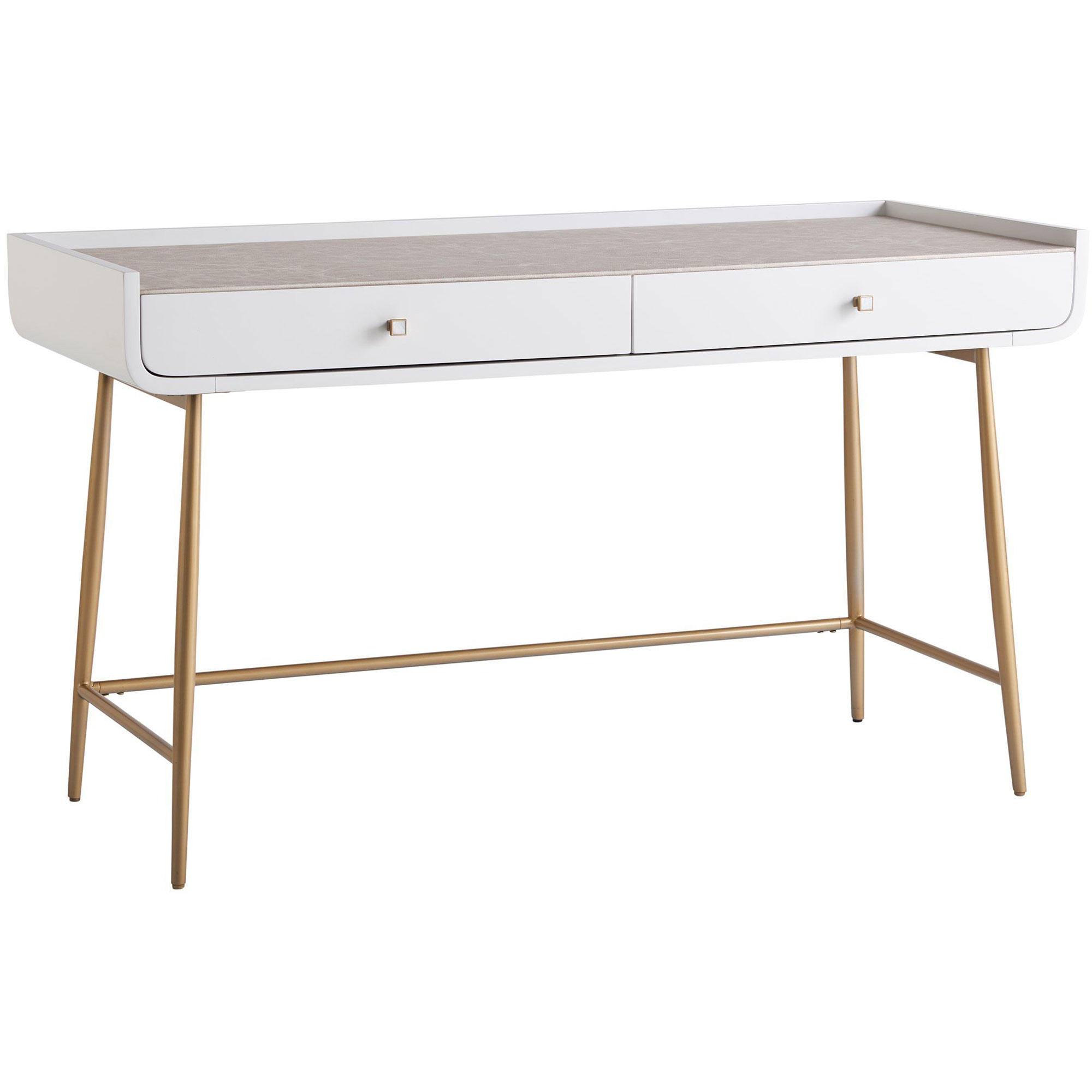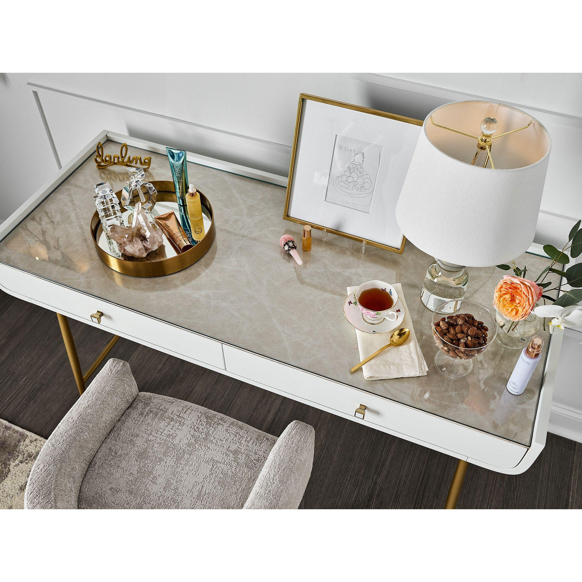 Perfectly suited for a bedroom, home office, and more, the Allure Vanity Desk was designed with every detail in mind. Featuring a glass tabletop inset with faux leather underneath, two drawers with mother of pearl hardware, a soft gold metal base, and a white lacquer finish, this desk embodies refinement.