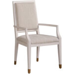 Sprinkle style around your dining table with the Love Joy Bliss Arm Chair, which is upholstered in a Woven Pewter fabric, features an Alabaster finish, and is perfected with soft gold metal caps on each leg.