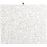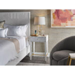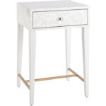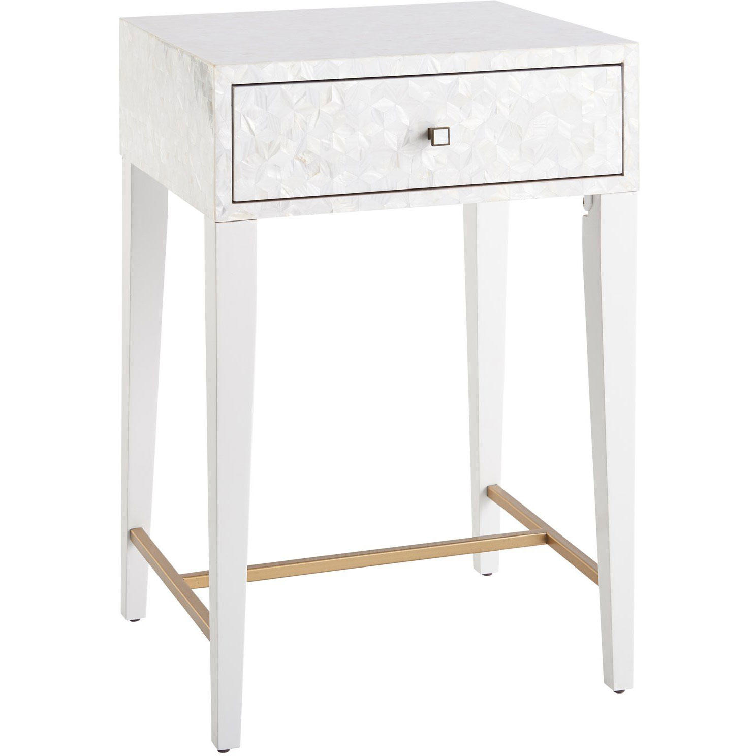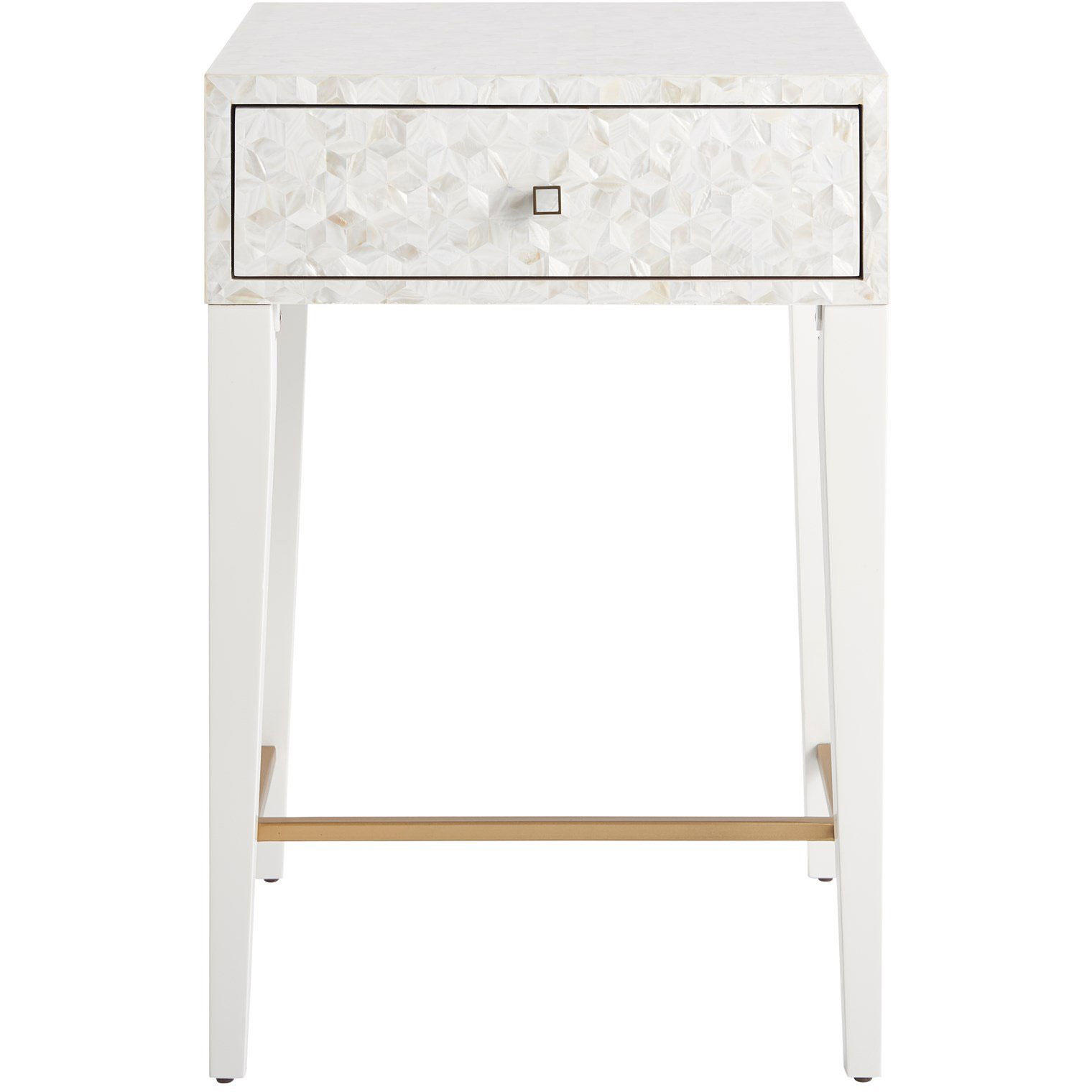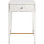 The Love Joy Bliss Bedside Table harmoniously exudes a perfect pairing of textures, with a mother of pearl overlay on the tabletop and drawer front, paired with a complementing white lacquer base. A sleek, linear design in soft gold metal adds additional interest and style at the base.
