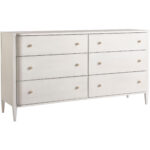 A clean Alabaster finish encases the Chelsea Dresser, which includes six drawers that are accentuated with soft gold, hexagonal hardware for a simple and streamlined look.