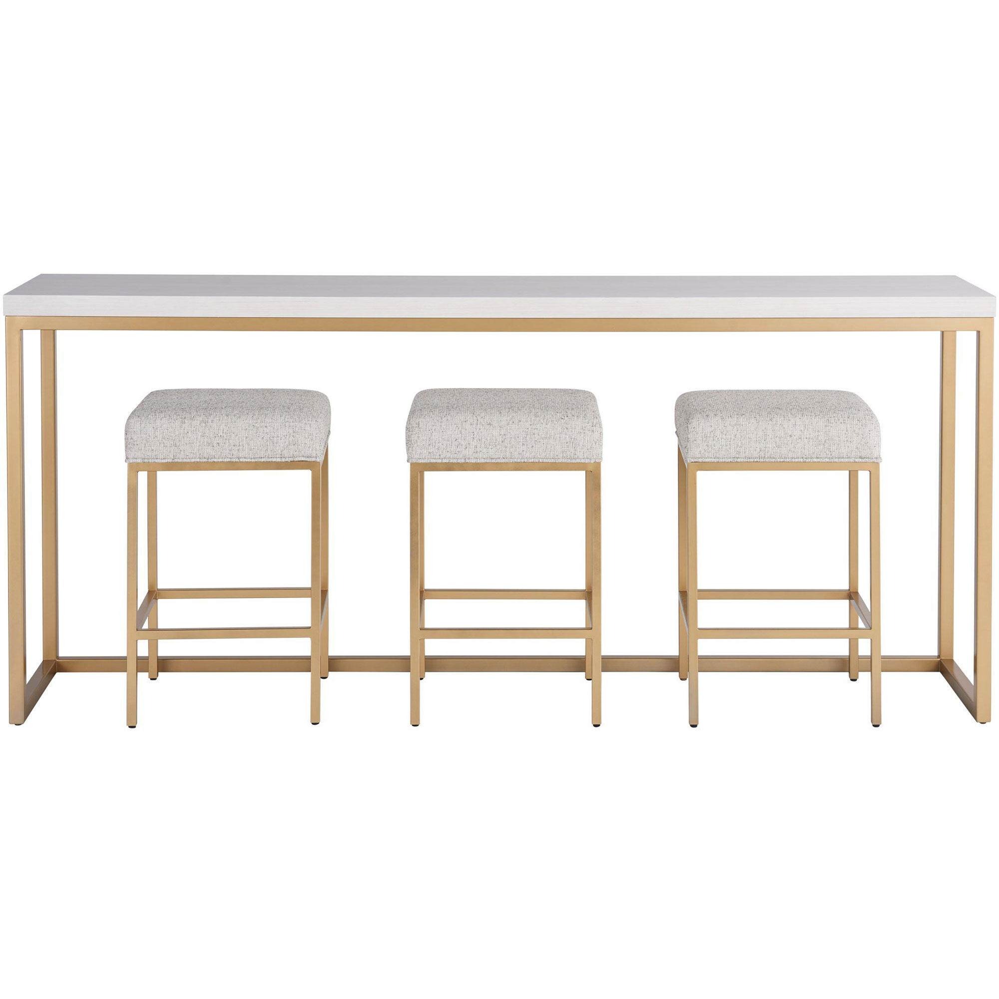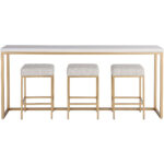 The Love Joy Bliss Console Table features a smooth tabletop in a chic Alabaster finish, which is accented by a soft gold metal base. Adding to its charm, this console table includes three upholstered accent stools, bringing additional comfort and convenience to spaces.