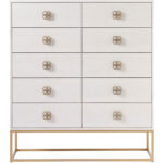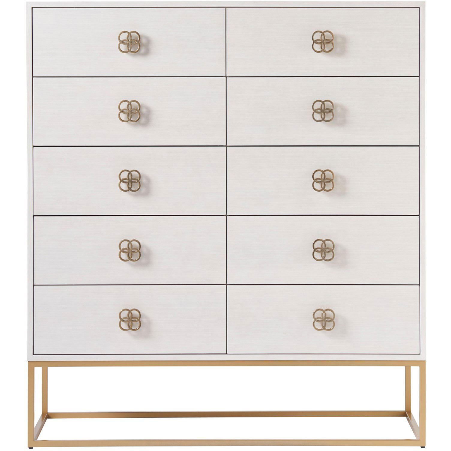 Exquisite and poised, the Peony Drawer Chest is crafted with ten spacious drawers that are accented with butterfly-inspired soft gold hardware and encased in a fresh Alabaster finish. A soft gold metal base completes this playful yet elegant storage piece.