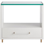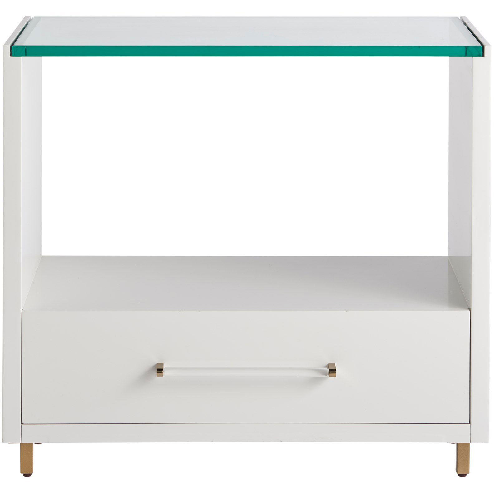 A charming juxtaposition of materials, the Peony Nightstand finds seamless balance between a glass top, soft gold and acrylic bar hardware and a chic White Lacquer finish. For added flair, the legs are also finished in soft gold.