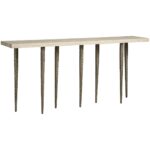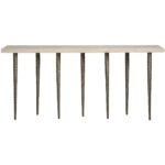 The Lowry Console is a striking piece of modern design that celebrates the interplay of positive and negative space. Its slender, nickel-finished metal legs create an airy, almost ethereal quality, while the solid white travertine top provides a grounding element. This bold combination of materials and minimalist design makes the Lowry Console a captivating focal point for any hallway or entryway.