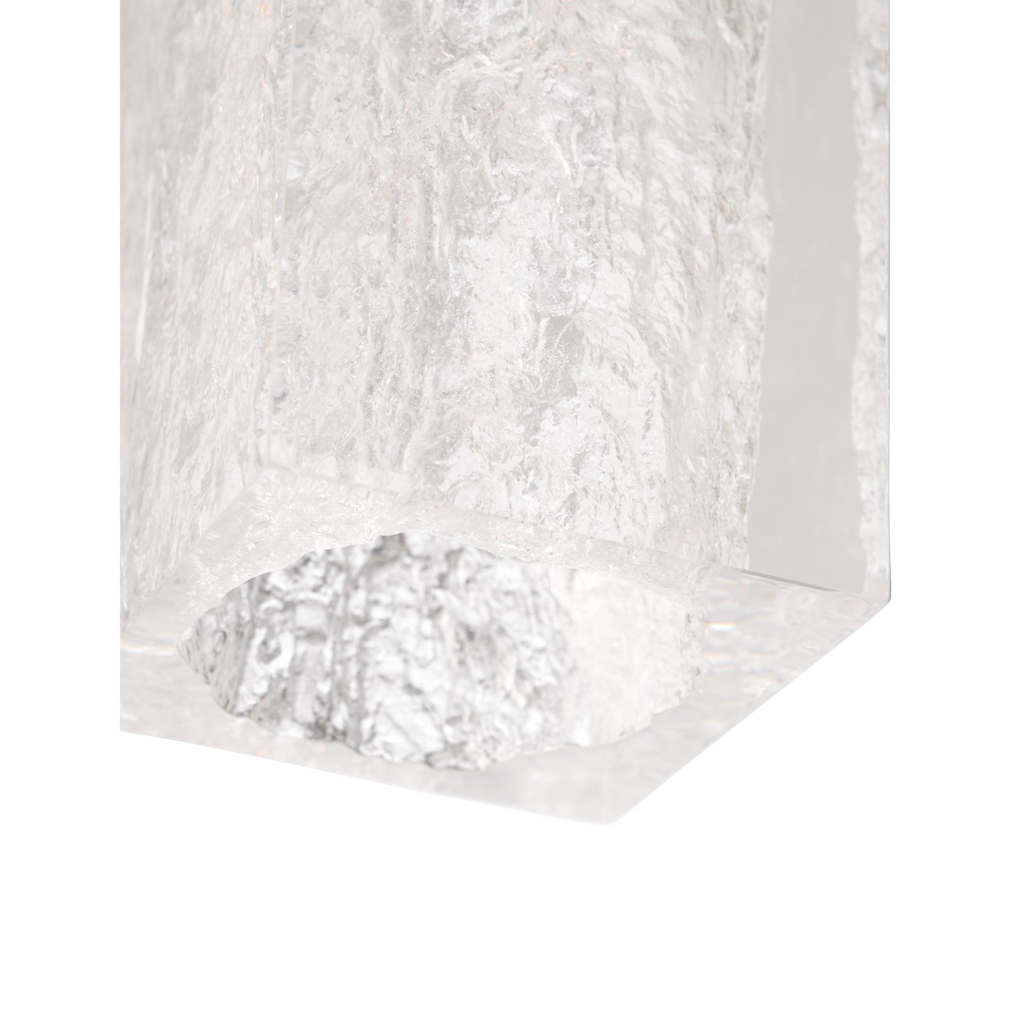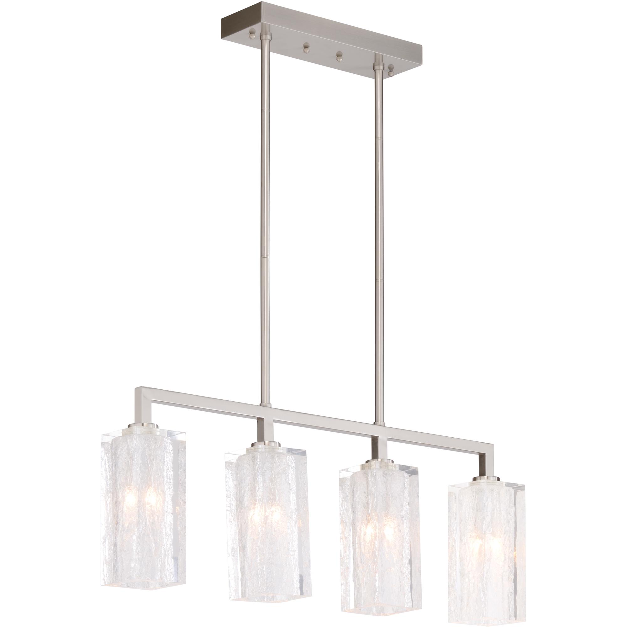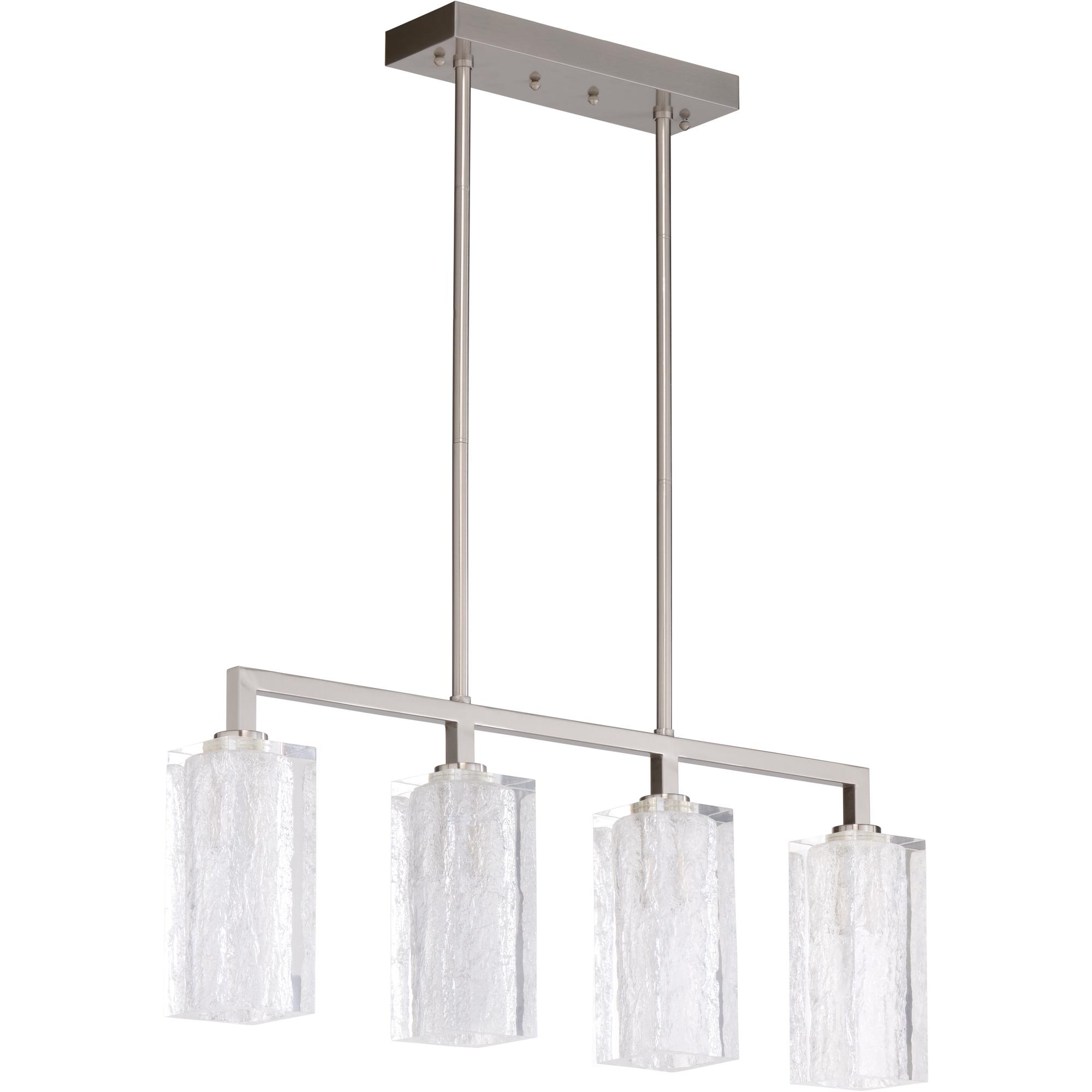 Lucallan four light pendant is a modern linear design perfect for over a kitchen island or bar. A satin nickel frame supports four lights that provide a softened warmth beneath shades of ice textured blocks of acrylic.