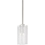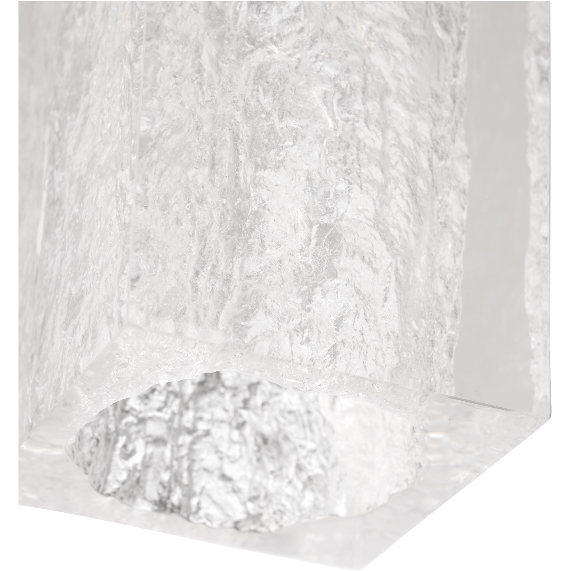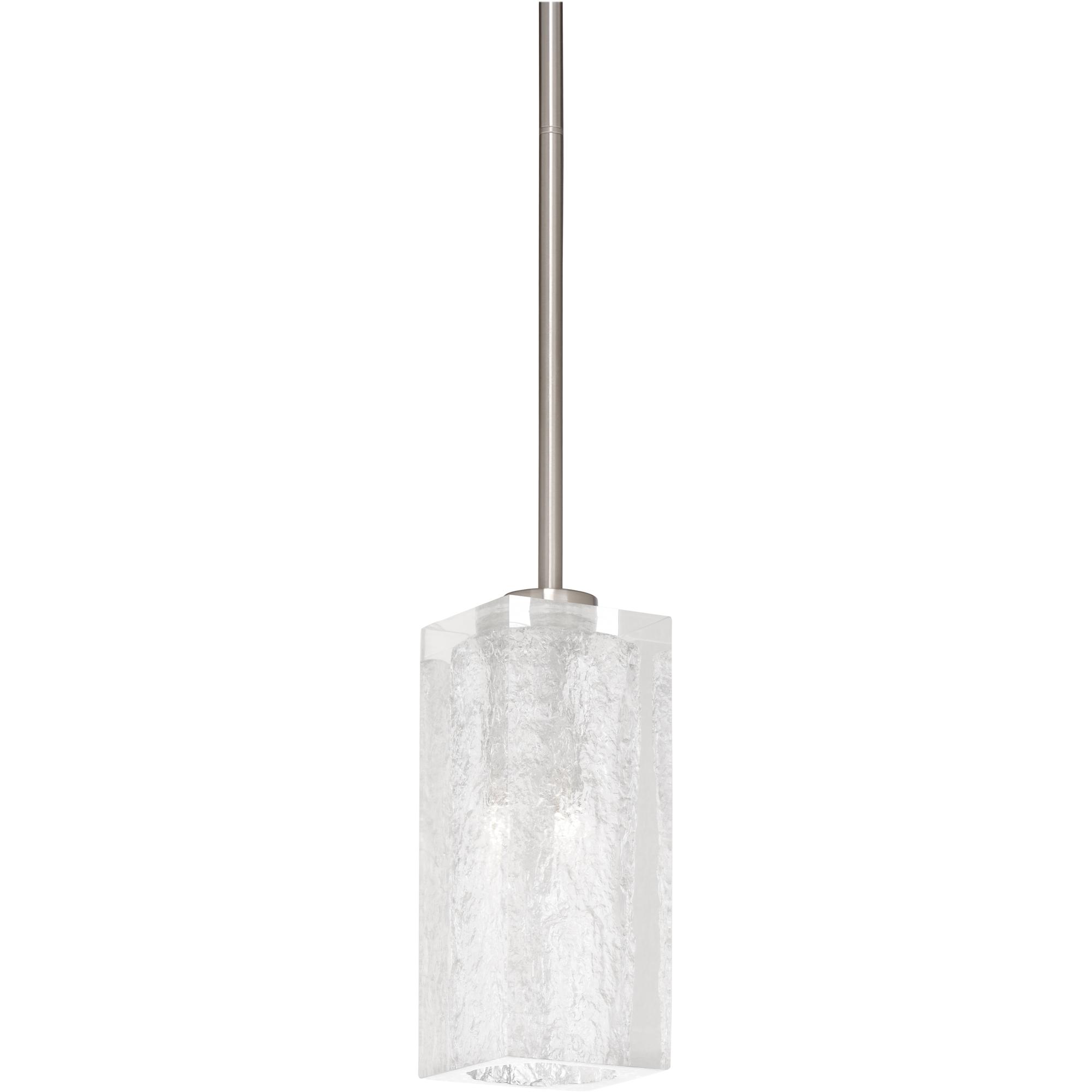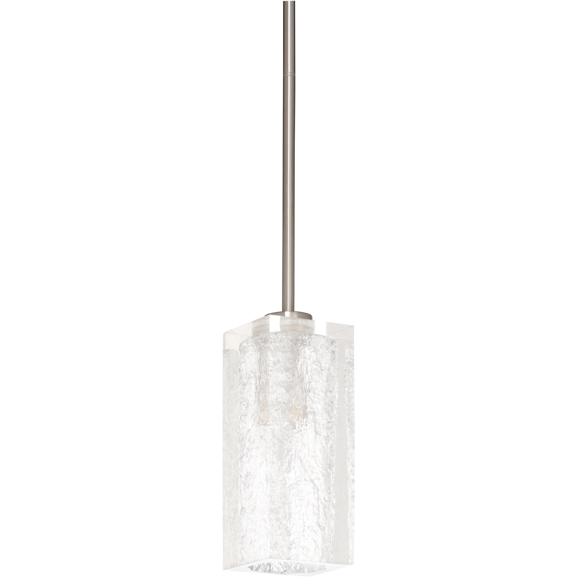 Lucallan pendant provides ambient light to your decor with its one candle socket set in an ice textured block of acrylic. Hanging from a satin nickel finished rod, this modern pendant is at home, alone or in pairs, over a bar, island or breakfast nook.