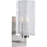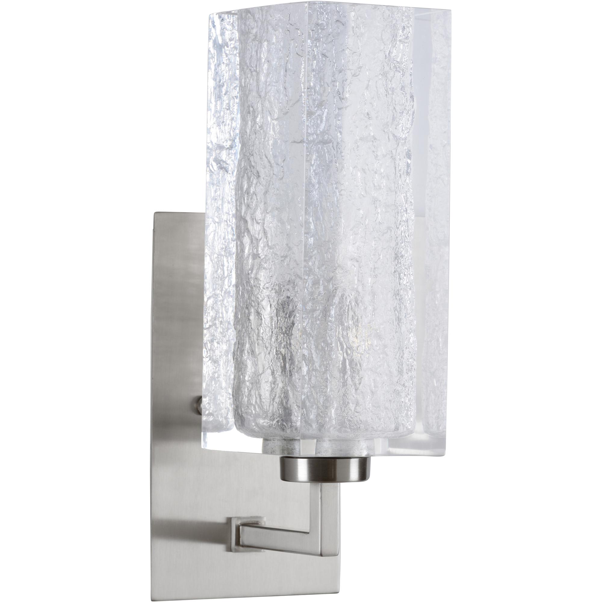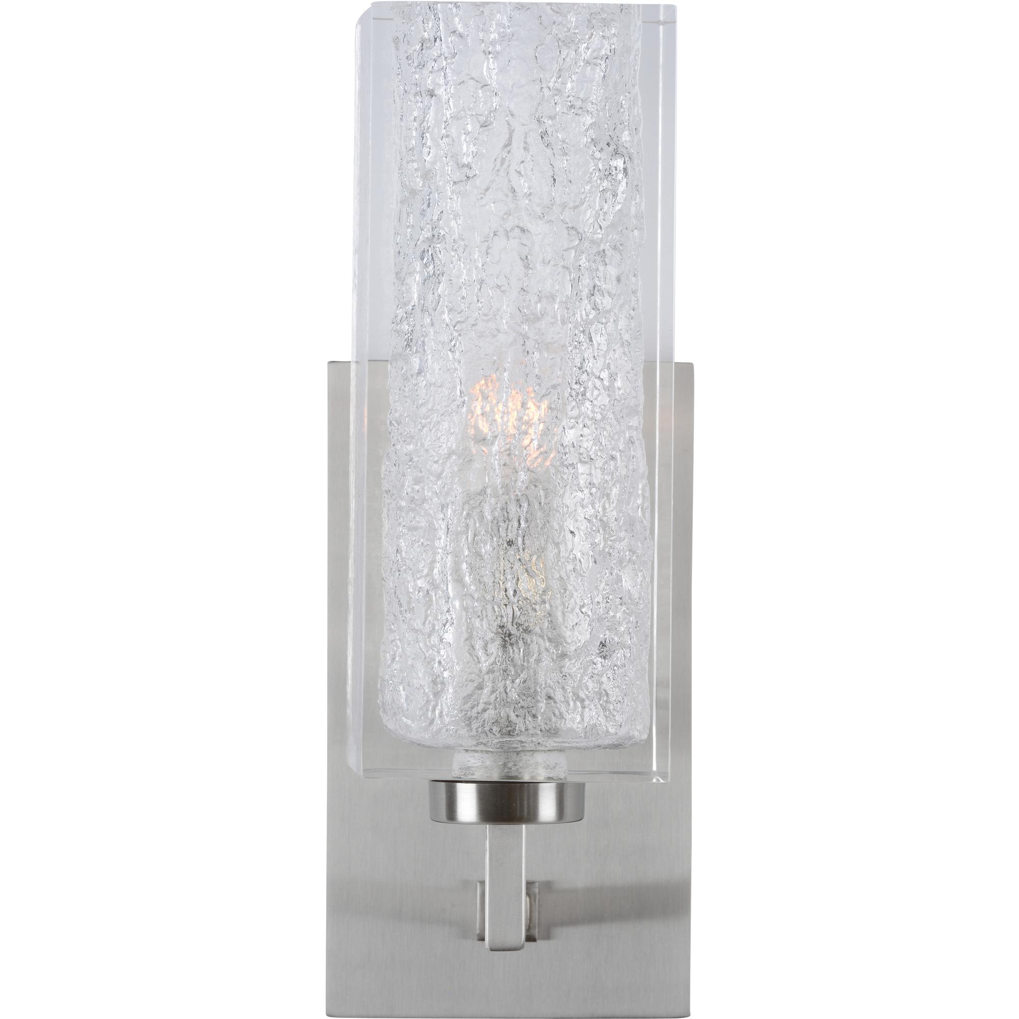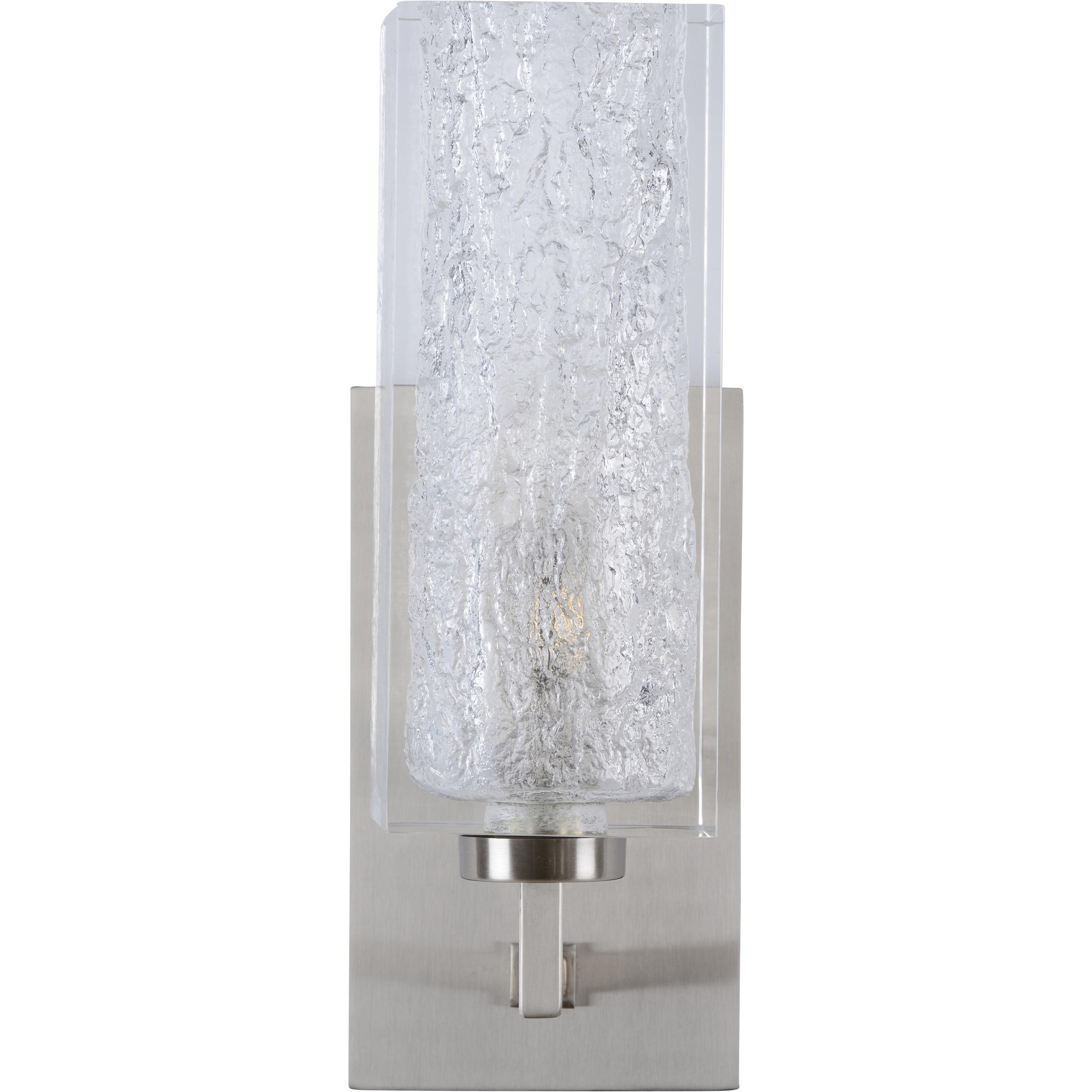 Lucallan sconce brings ambient light to your design with its one candle socket set in an ice textured block of acrylic. With its satin nickel finish, this modern wall sconce will be at home in hallways, bathrooms or paired to flank a mirror or piece of art.