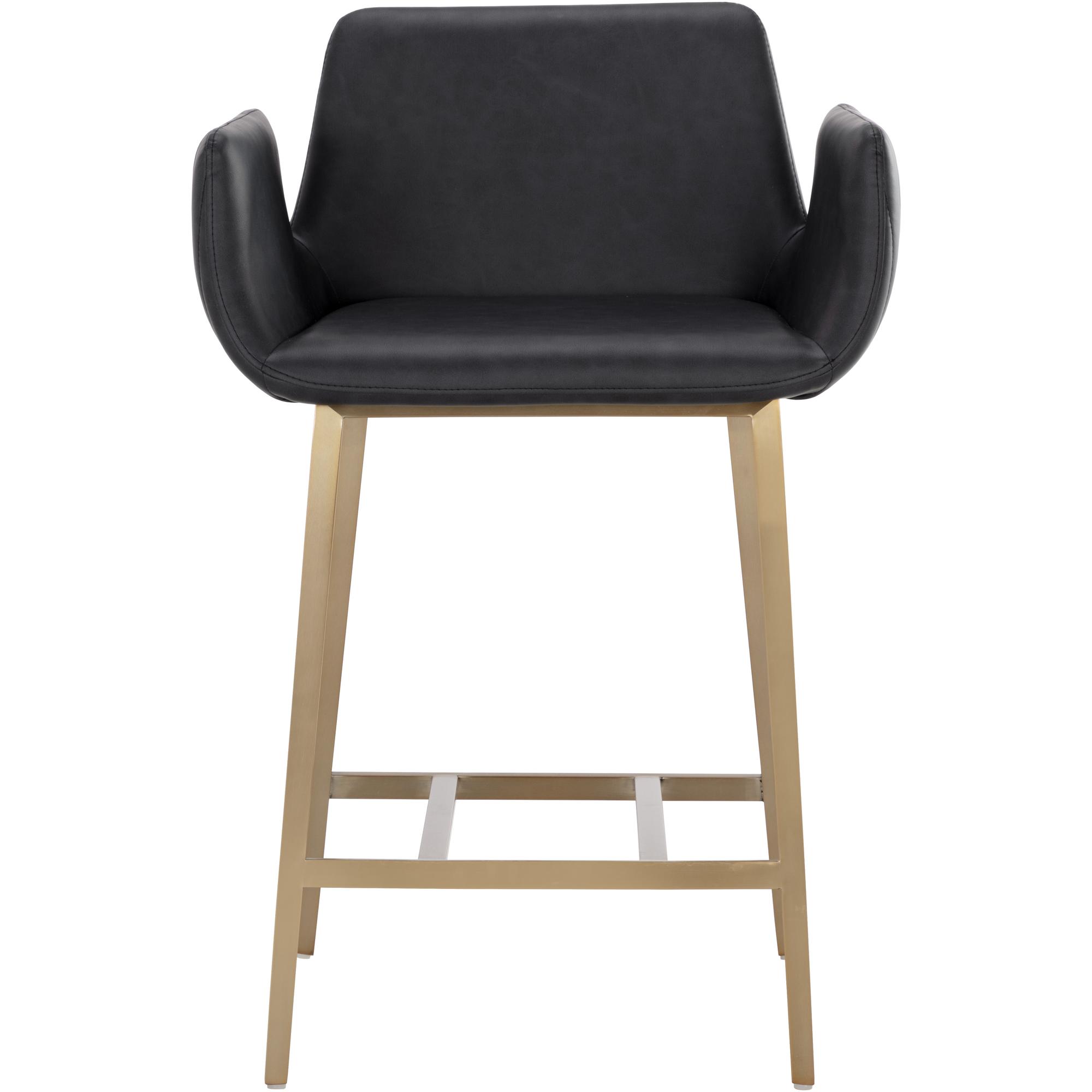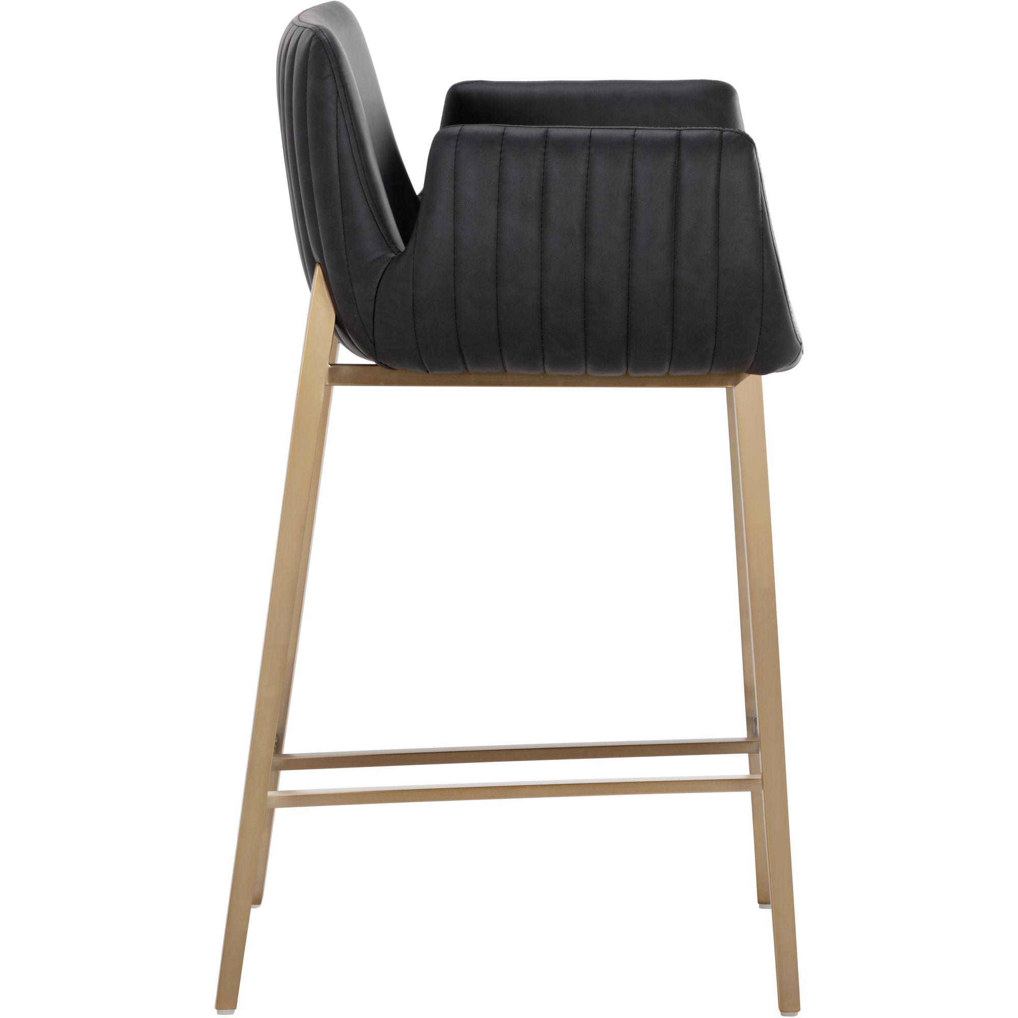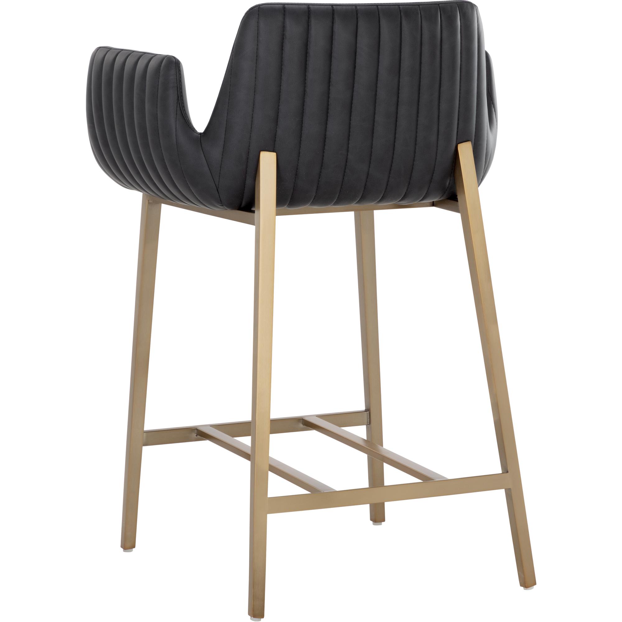 With its stunning scooped design, the Lucano Counter Stool is an impressive addition to any dining space. Features vertical channel tufting on exterior seat. Stocked in smooth bravo black faux leather and completed with gold stainless steel legs.