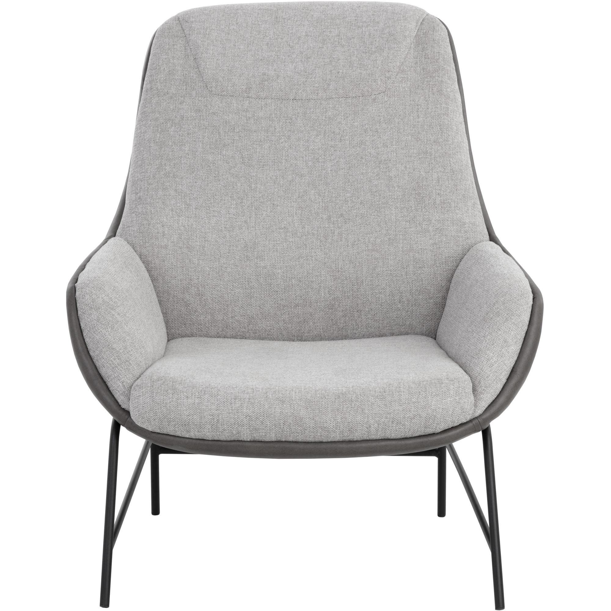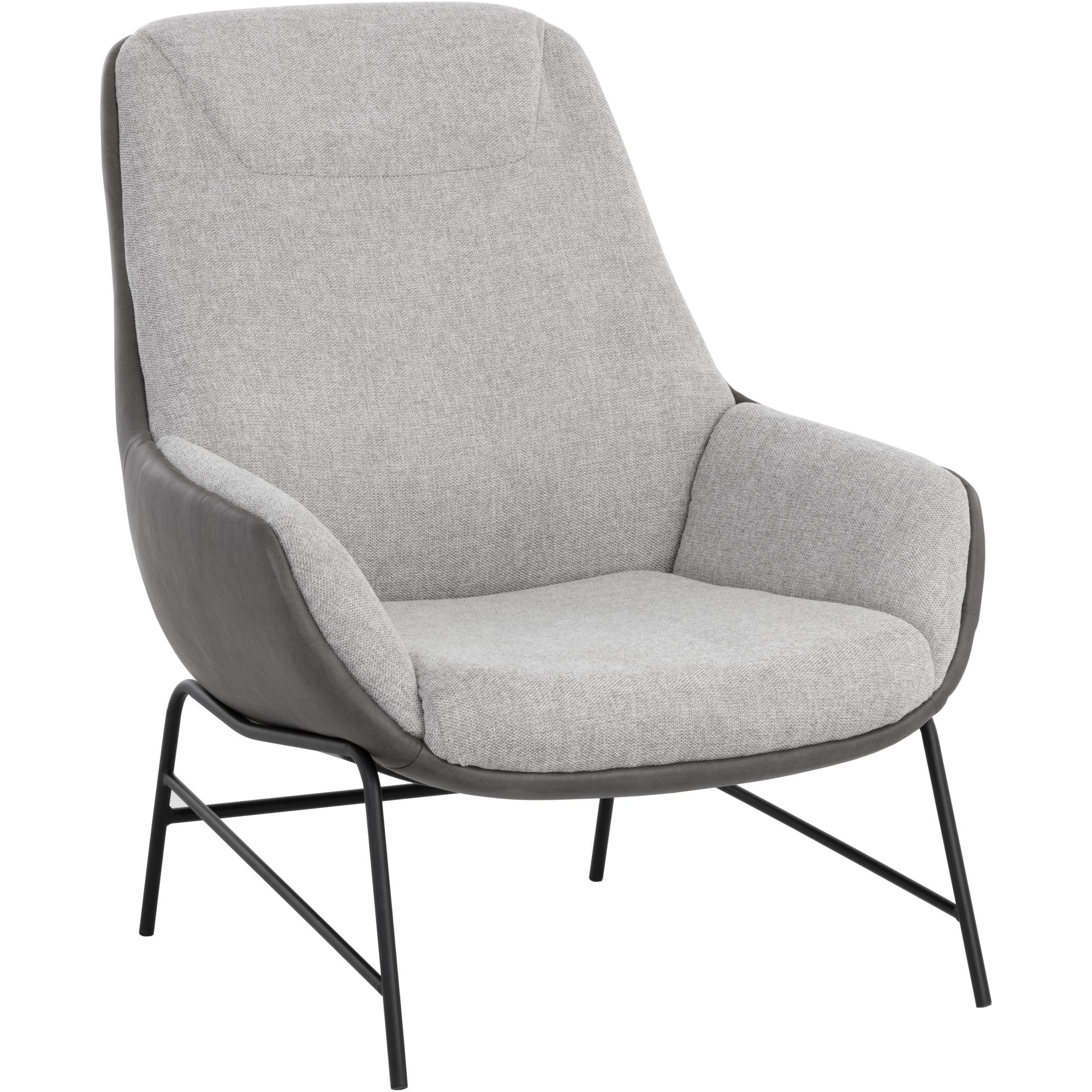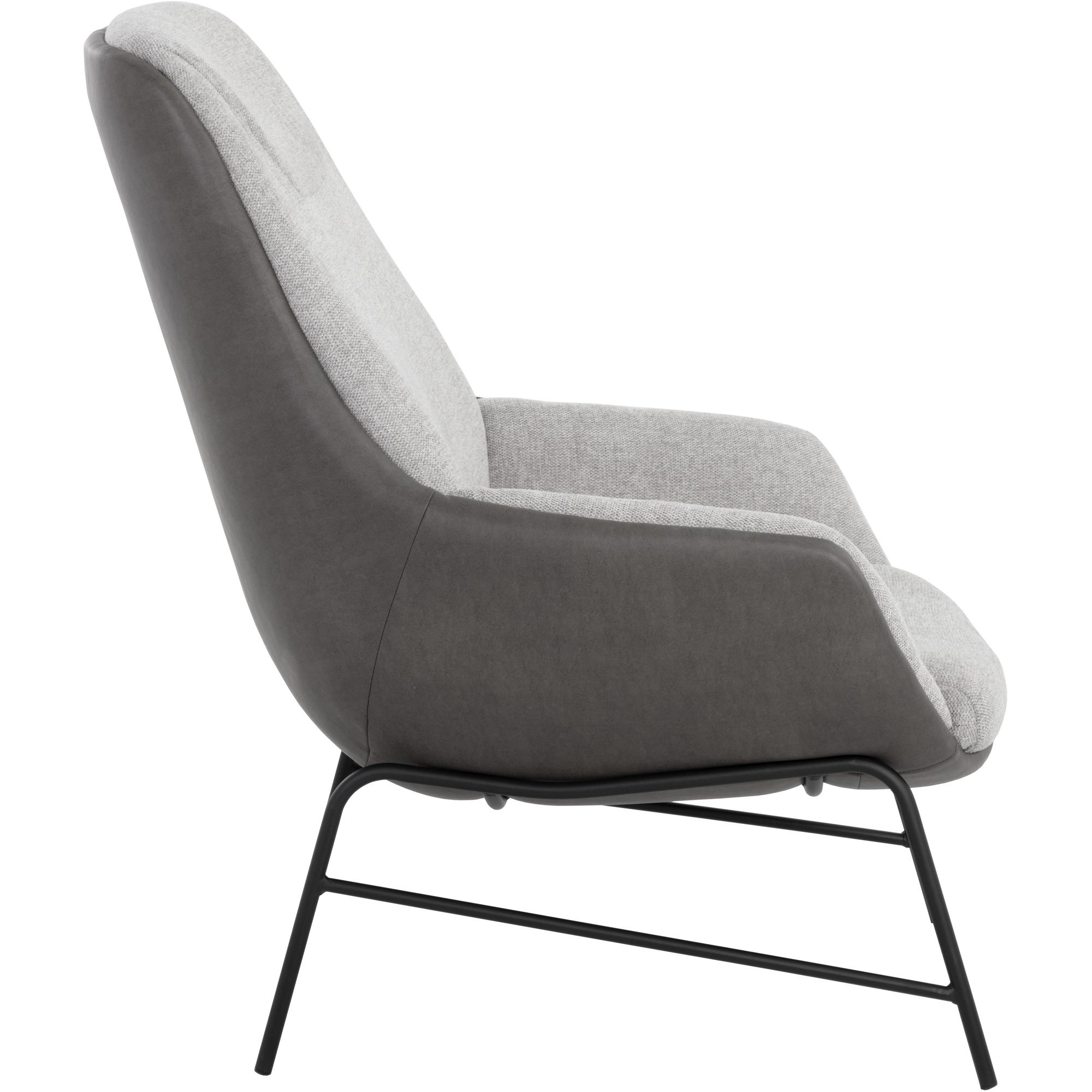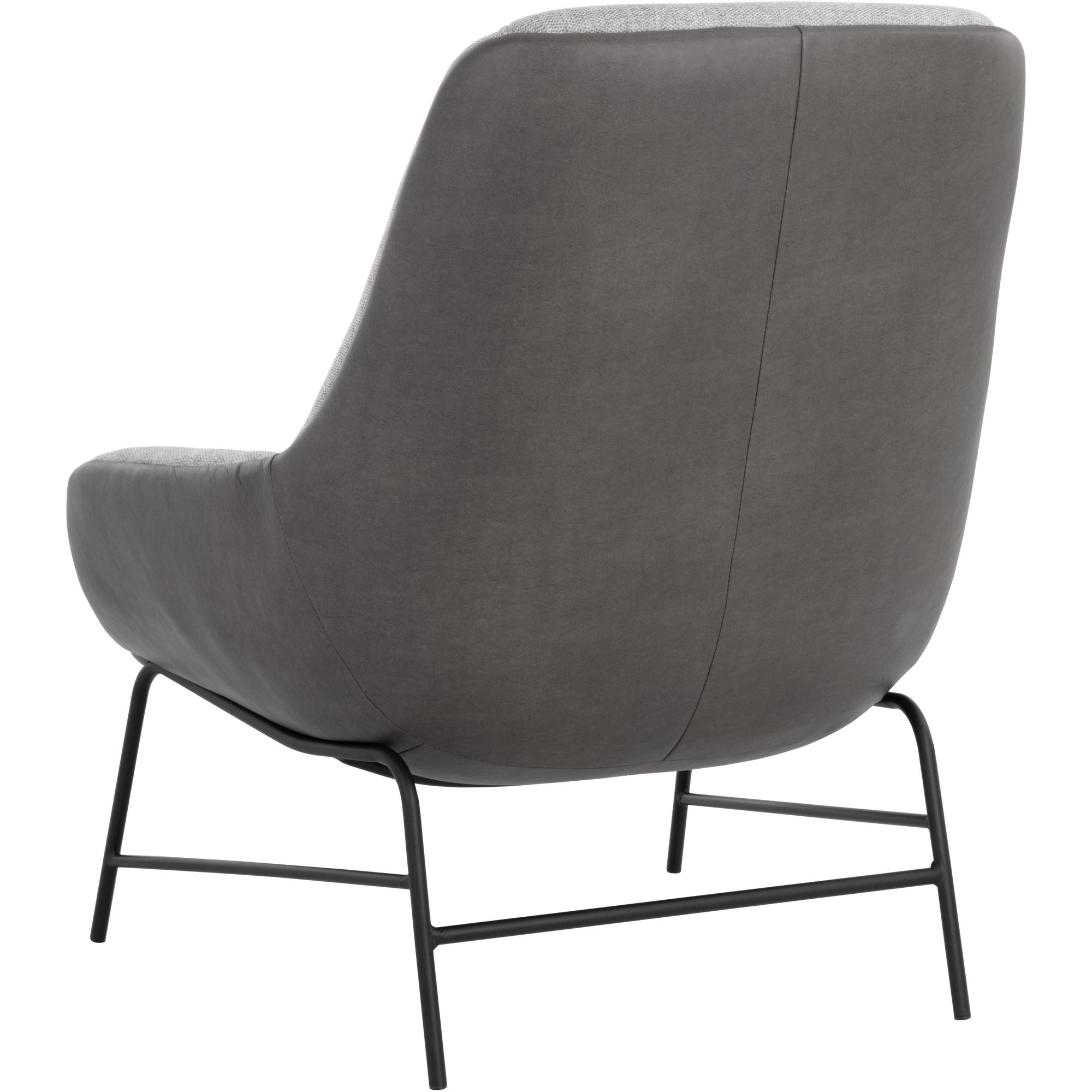 This handsome lounge chair is defined by modern design elements. Features a comfortable seat in belfast heather grey fabric with a bravo ash faux leather exterior. Black powder coated metal legs complete the look. Also available in belfast oatmeal fabric with bravo cognac faux leather. Handle With Care: This design has been crafted with faux leather. Faux leather is manufactured to reflect the natural characteristics of leather; as such, colour variations, markings wrinkles, grooves, and light scratches are appreciated characteristics. No two pieces will be alike. Visit our Product Care page for more information on how to ensure the lasting beauty of this piece.