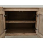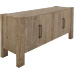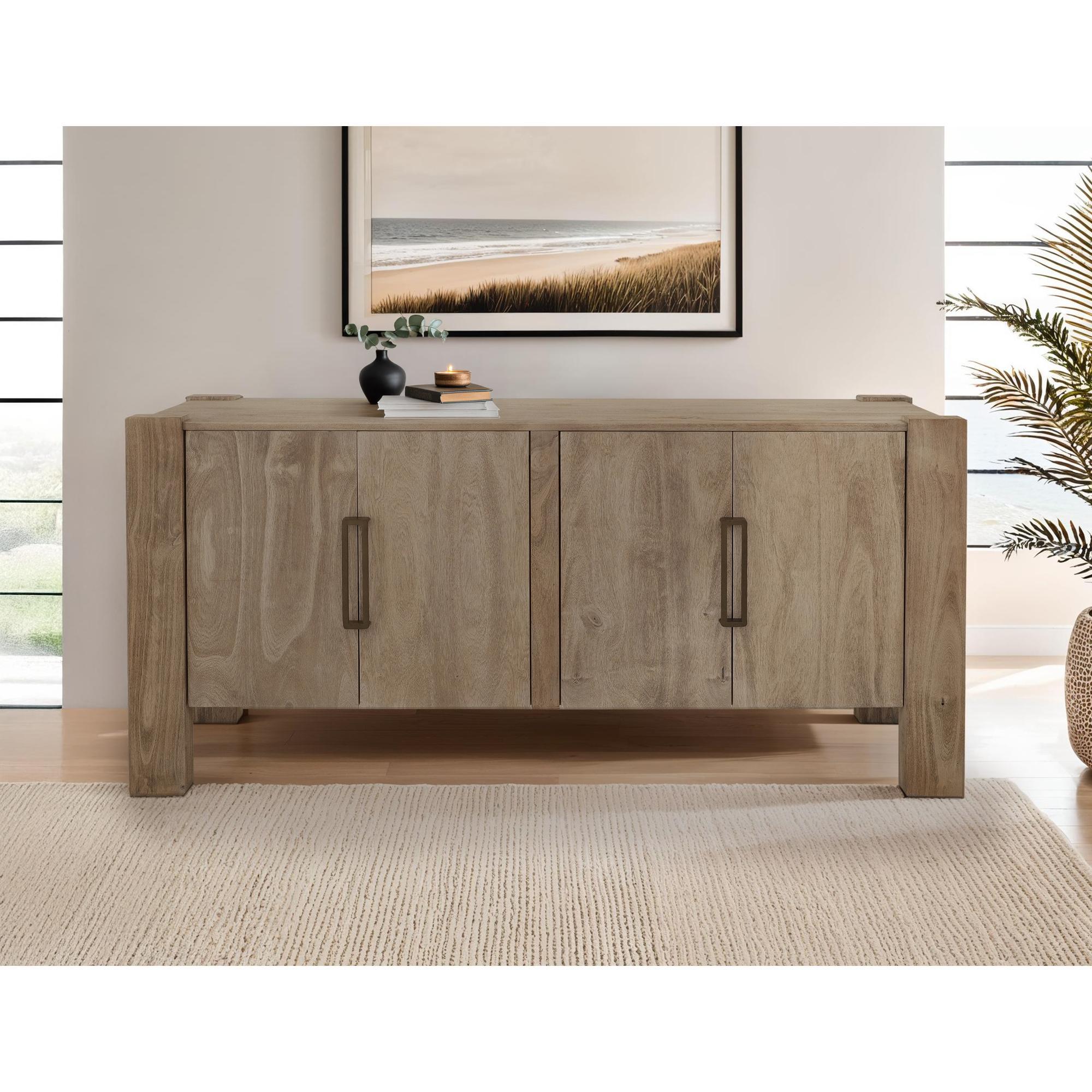 The Luma Console is a beautifully crafted piece of furniture made from melina wood. Its warm sand-brown finish highlights its natural and earthy appearance and visible grain patterns. This sturdy piece has a simple yet elegant design, including four doors with an overlay hinge mechanism for gentle and quiet closing. The rectangular handle in the center allows easy access to the storage compartments, revealing shelves inside. This design reflects a clean and functional aesthetic.