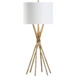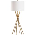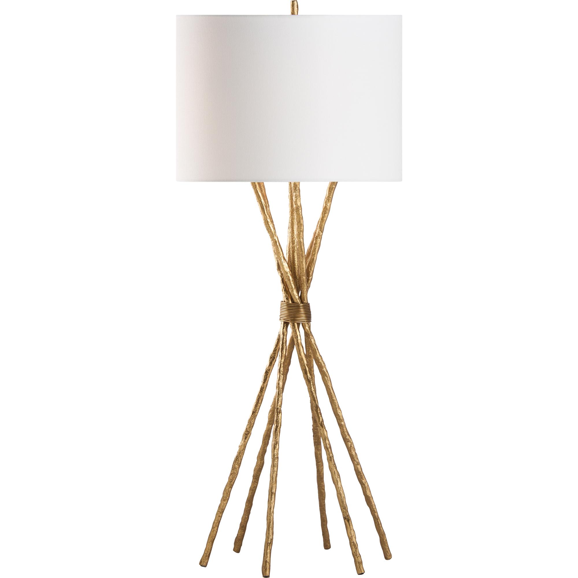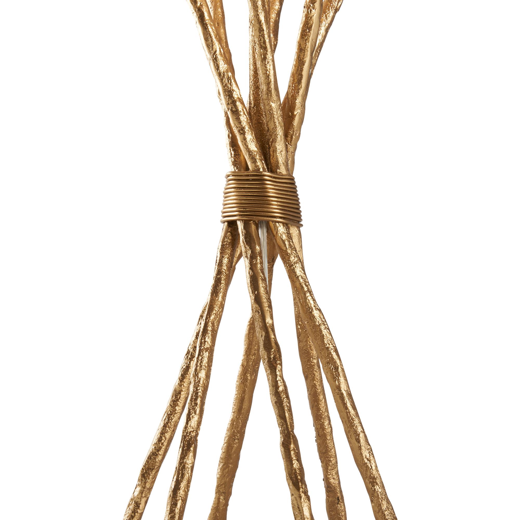 This gold lamp features a sculptural base resembling slender sticks elegantly bound together by a sleek metallic band, creating a refined and artistic silhouette. Its minimalist design and warm golden finish lend a touch of sophistication and modern charm to any space.