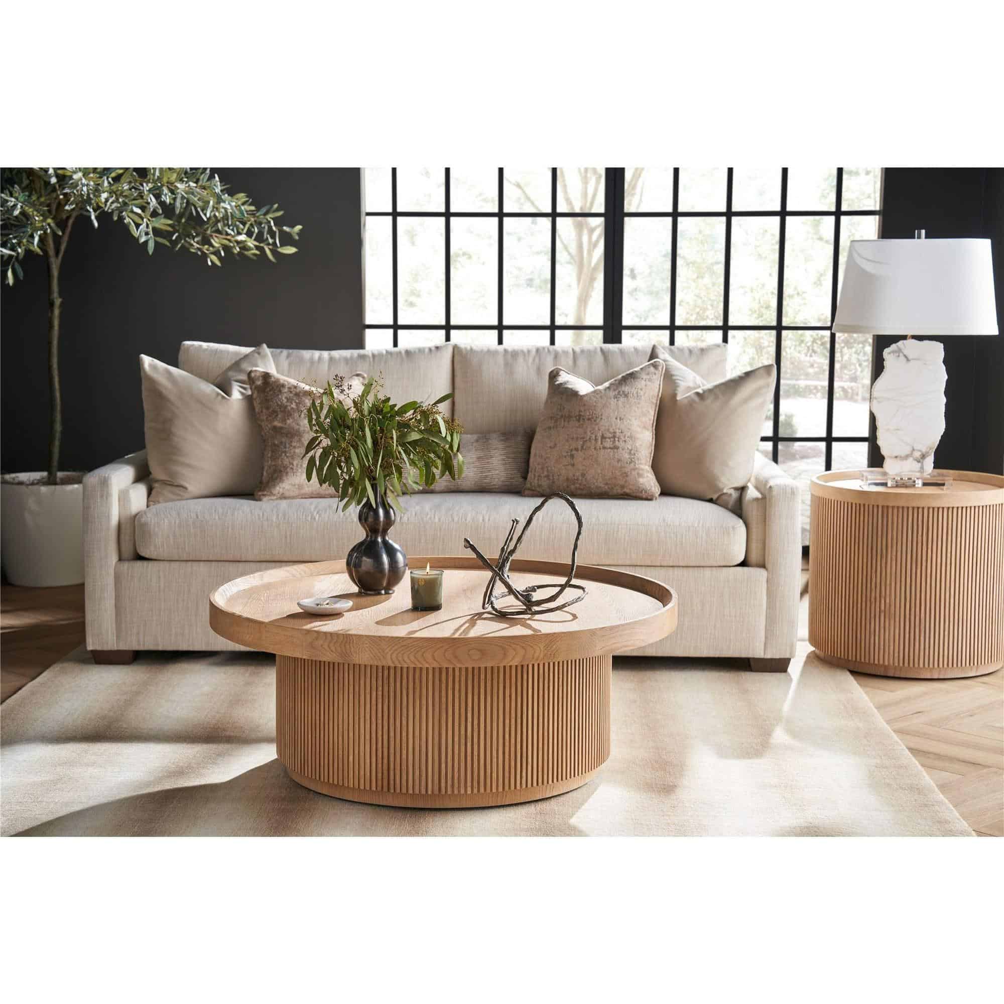 The Lumi Cocktail Table, with its inviting Natural Oak finish and tambour-wrapped base, combines simplicity with organic appeal. Mounted on casters for versatility, its gorgeous ridged detailing adds just the right amount of textural intrigue, enhancing any space with a touch of natural elegance and understated sophistication.