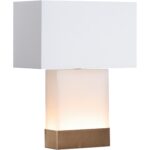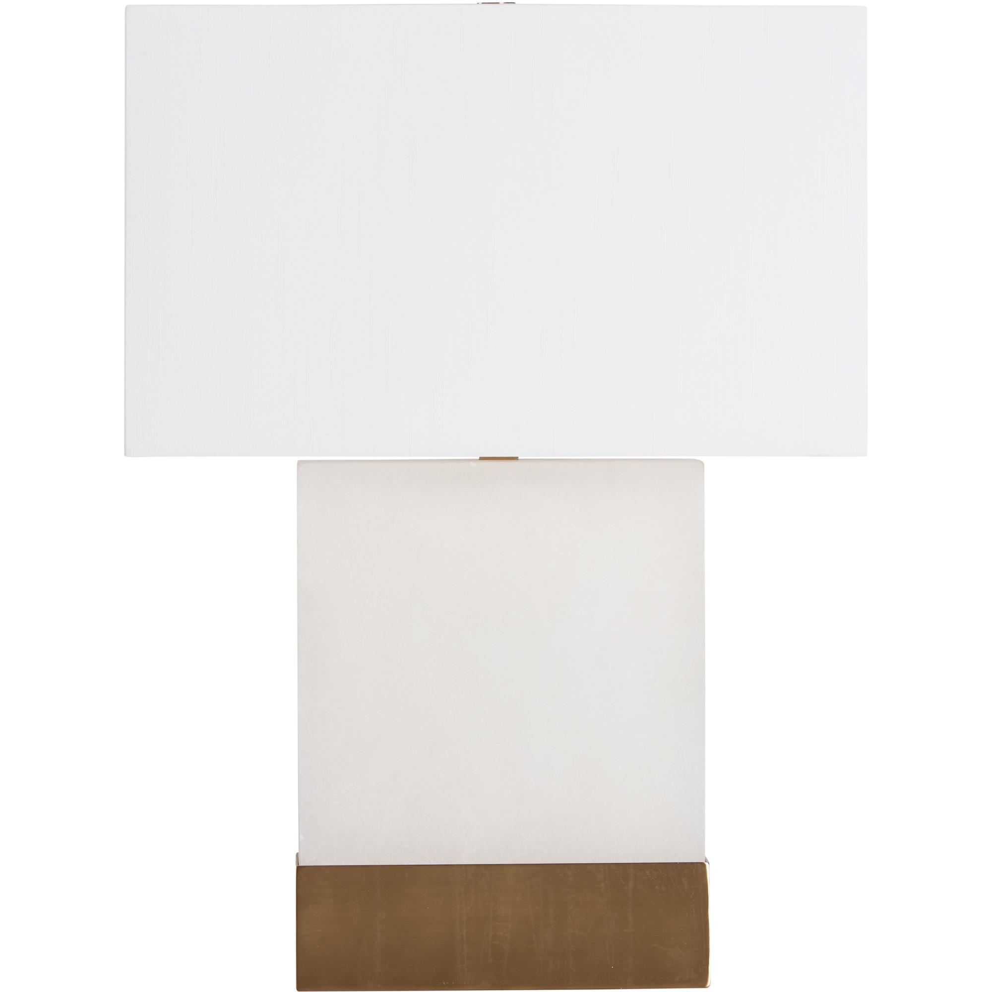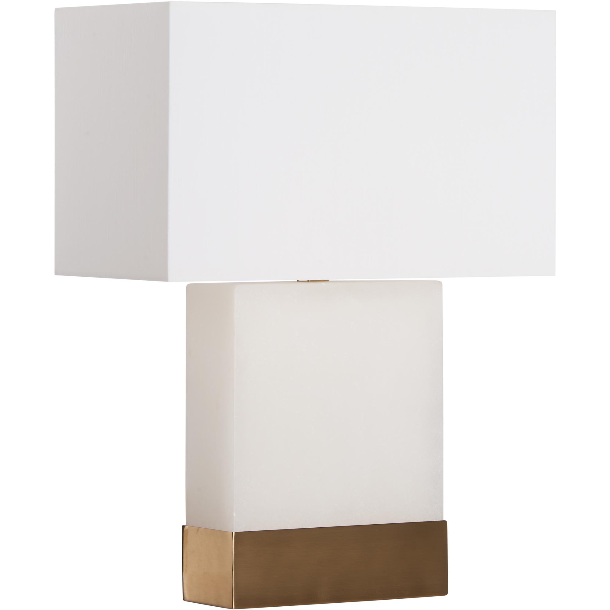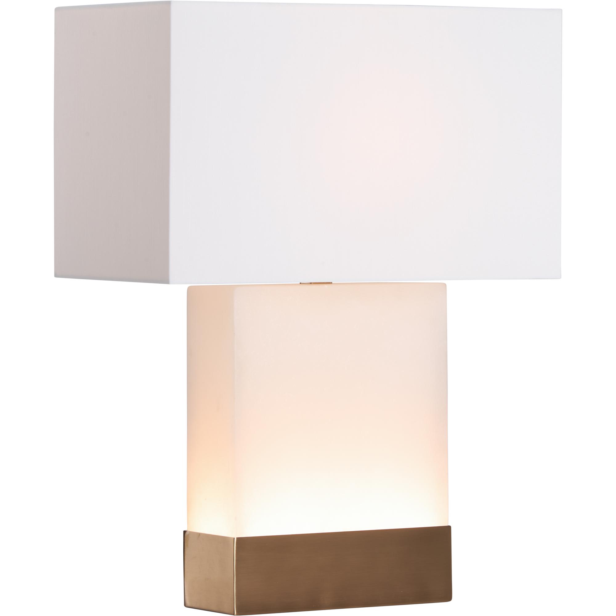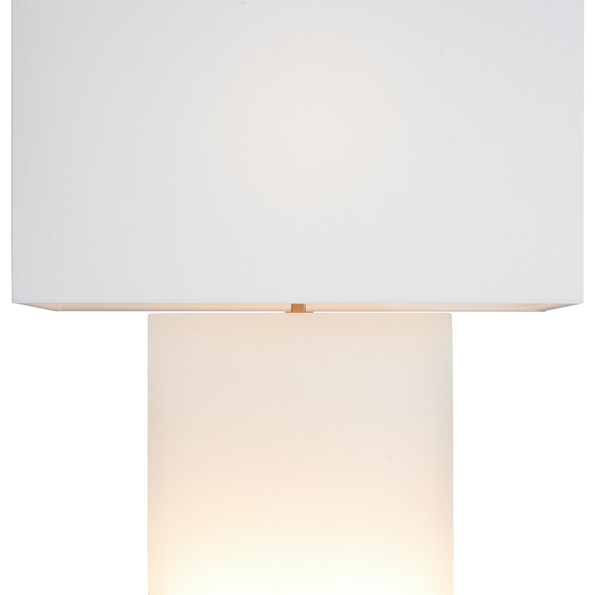 This alabaster lamp glows warmly from within, highlighting its natural and soft texture. A sleek brass band around the base adds a refined, modern touch.