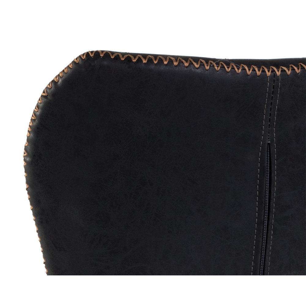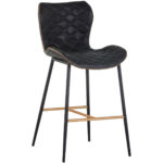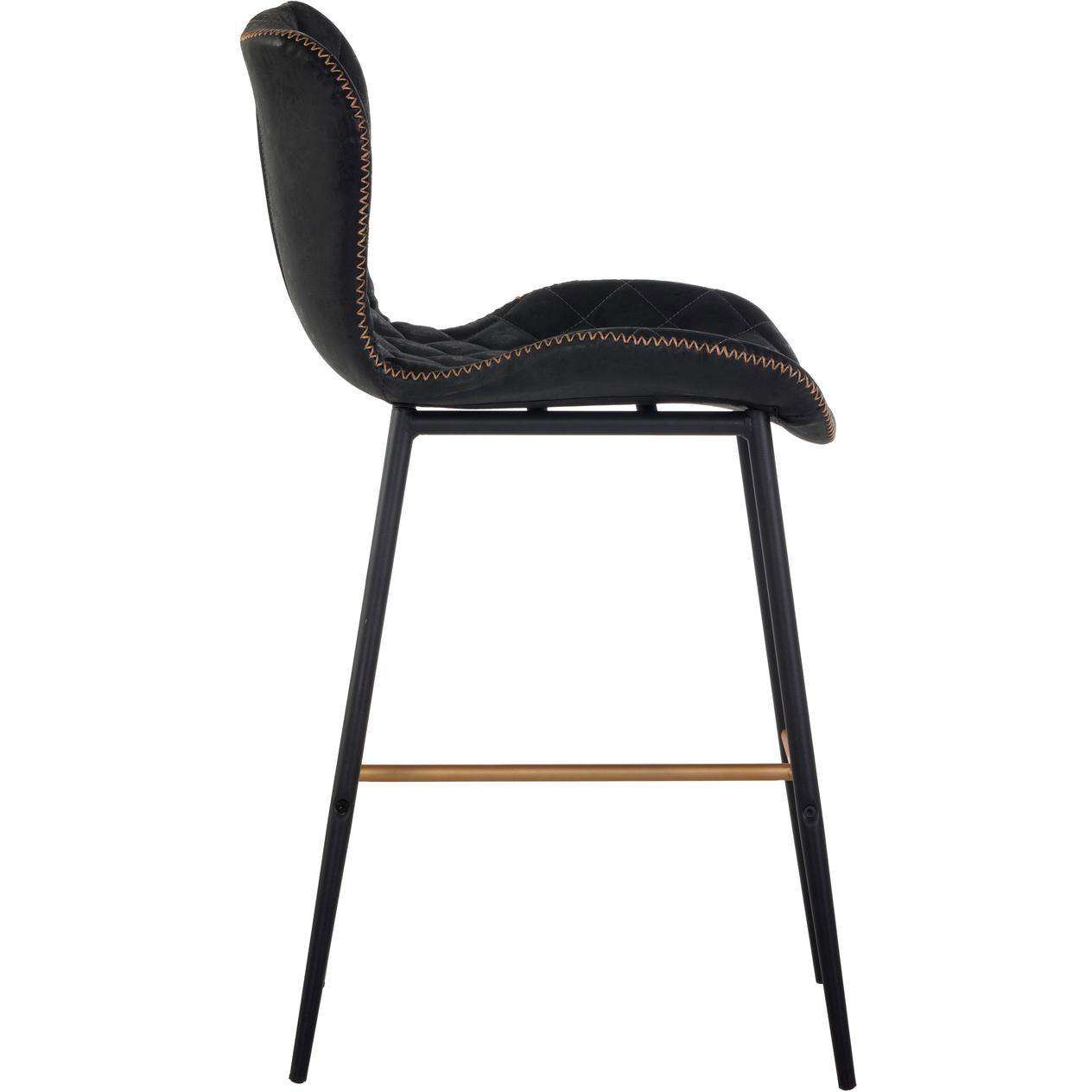 A stylish counter stool featuring a sculpted diamond-stitched seat and exposed zig-zag stitching along the seat frame. Stocked in antique black faux leather with black steel legs. Stretchers in a champagne gold painted finish complete the look. Suitable for various dining, kitchen and bar spaces of all sizes.