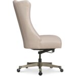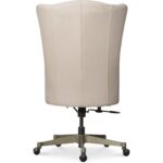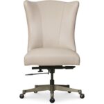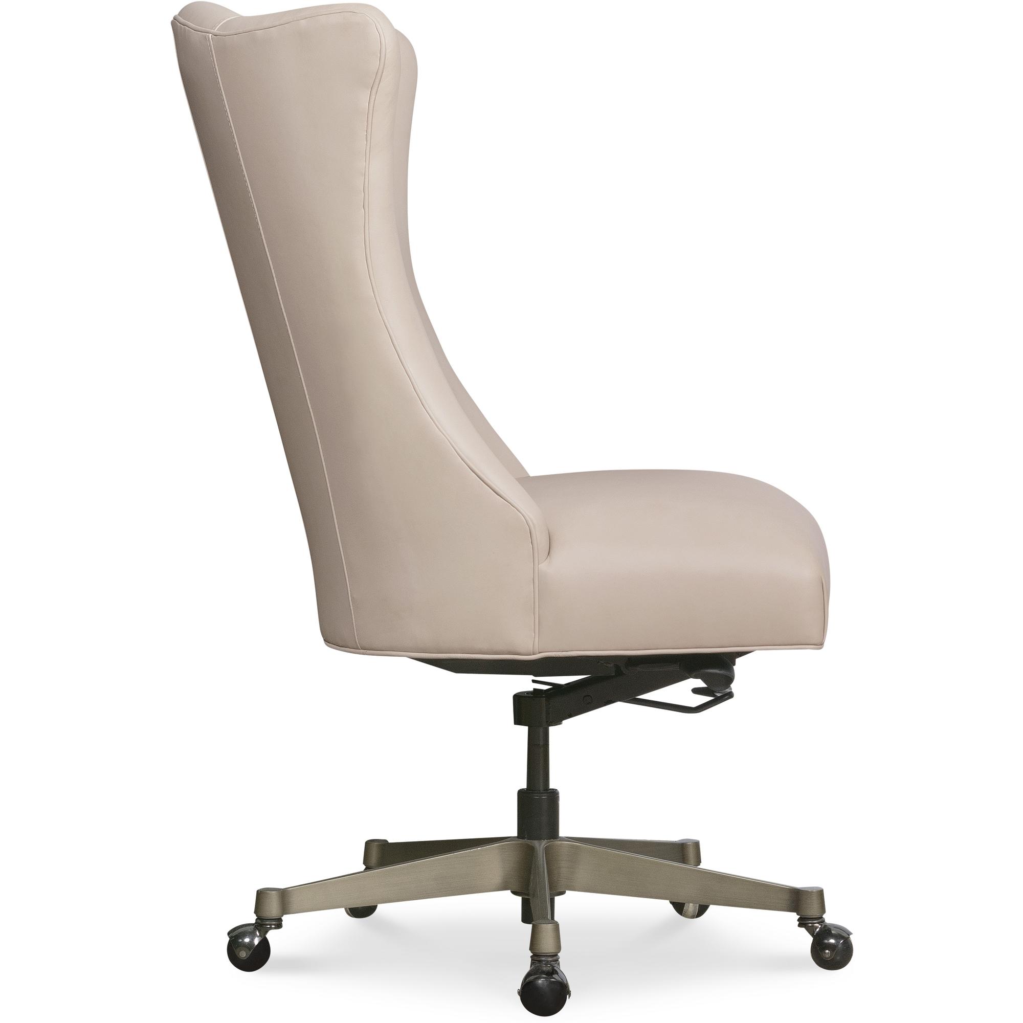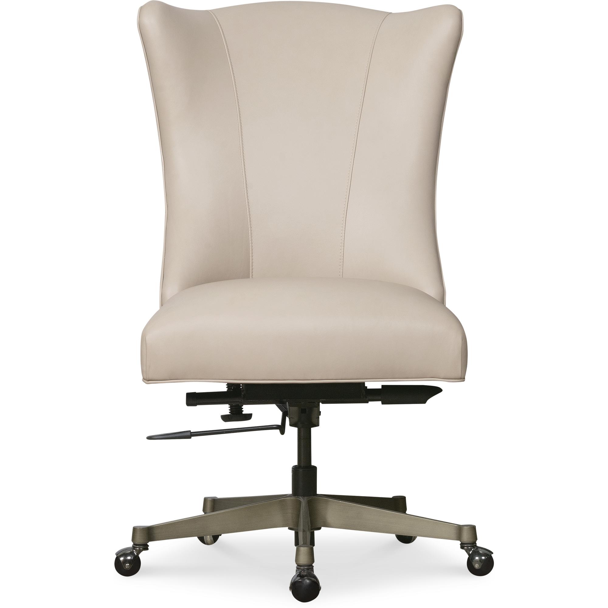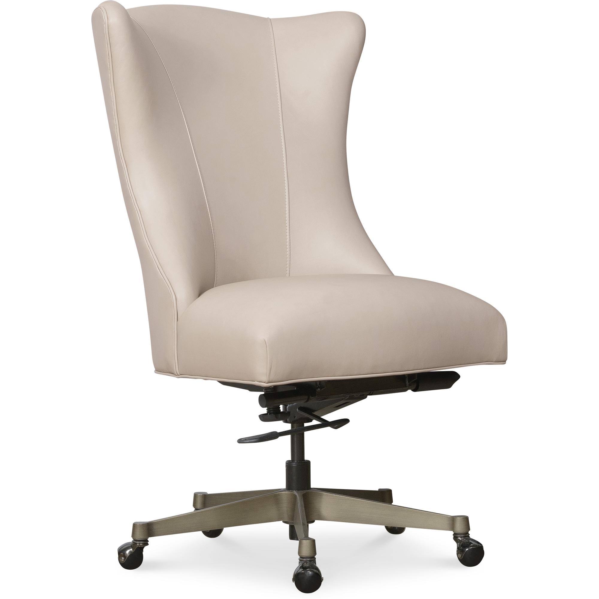 Features: Soft-transitional executive scale task chair with high and dramatic flared back Glazed gold metal base Black nickel casters Leather is a monochromatic color with matte sheen and has been pigmented, corrected and embossed with smooth grain for natural characteristics and has a soft talc finish