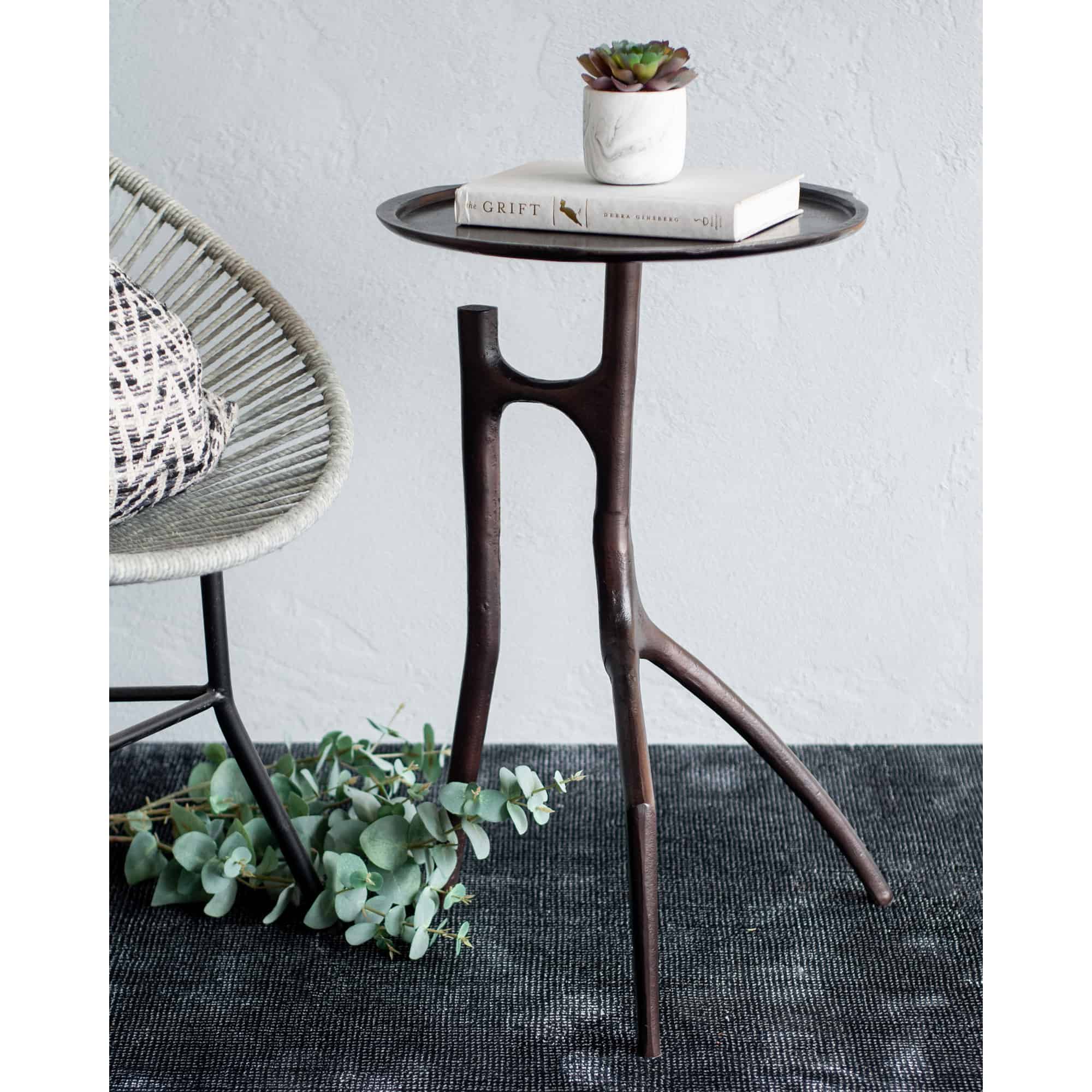 This side table takes inspiration from organic elements and carries it into the interior. Composed of plated aluminum, its simple colour palette allows its design structure to take the spotlight. Standing at 25 inches in height, it brings versatility into the home.