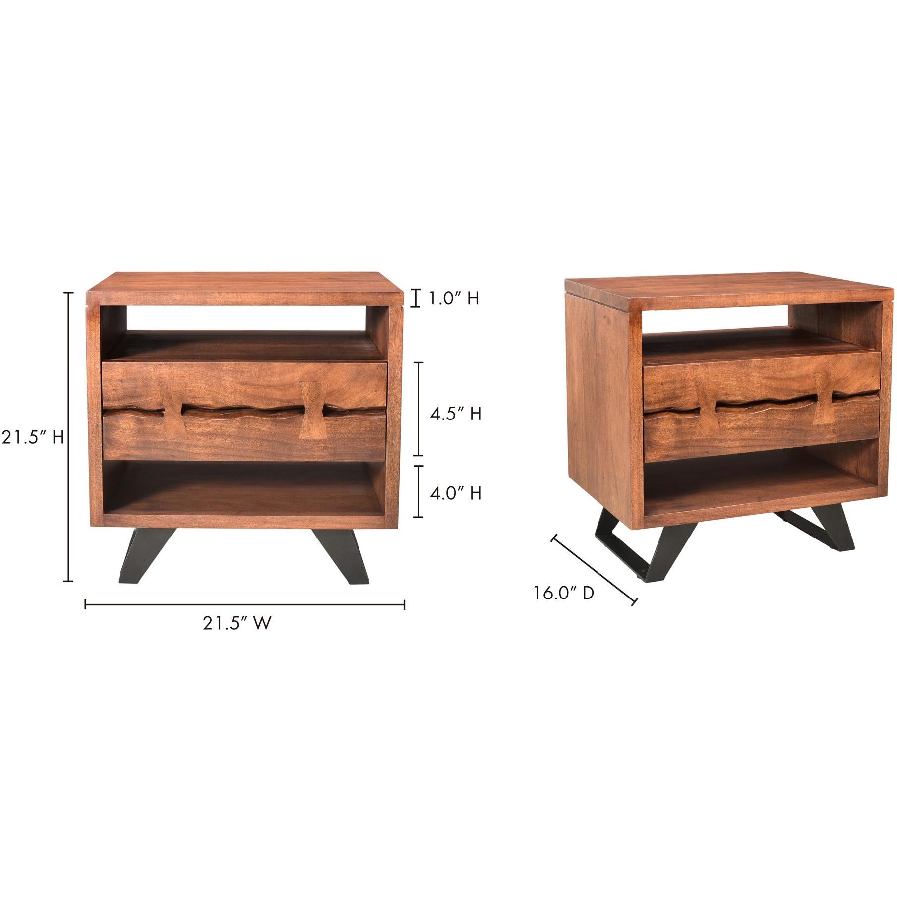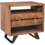 Crafted from solid Acacia wood and supported by geometric steel legs, the Madagascar nightstand offers an aesthetically pleasing rugged appeal blending rustic and industrial design. Thoughtfully designed with a single drawer between two open spaces to cater to your bedside essentials, this piece is both practical and visually captivating.