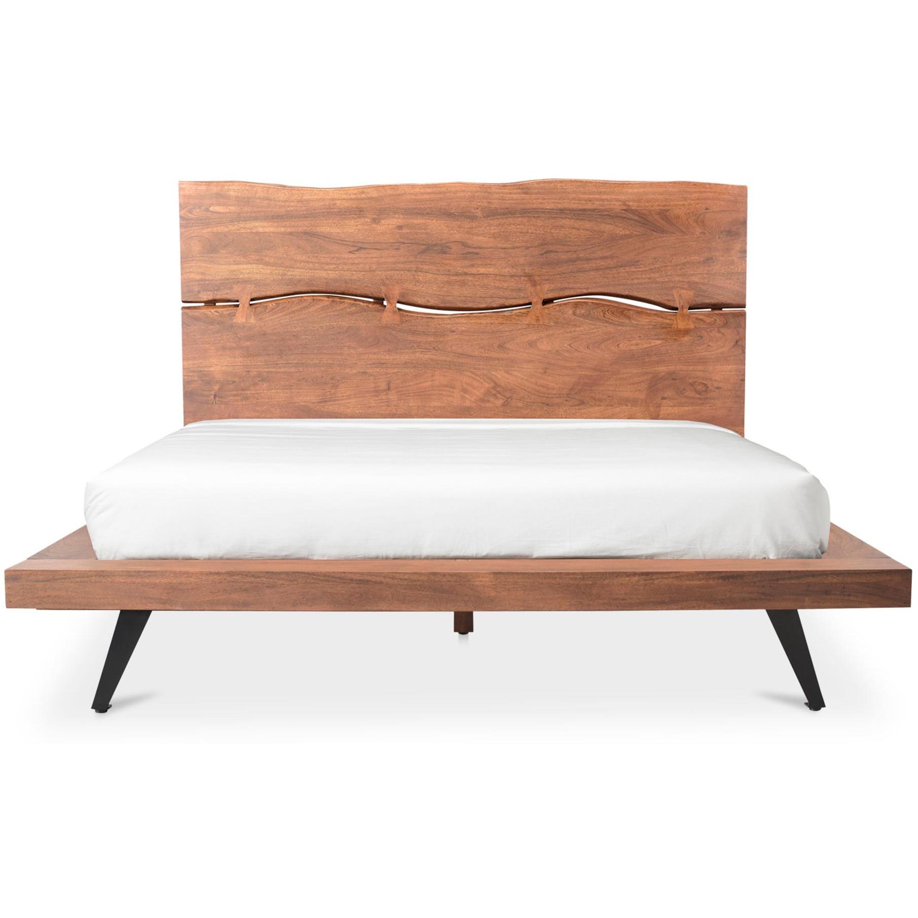 - Solid acacia wood frame with angular, powder-coated steel legs. Organic edge headboard with butterfly joinery