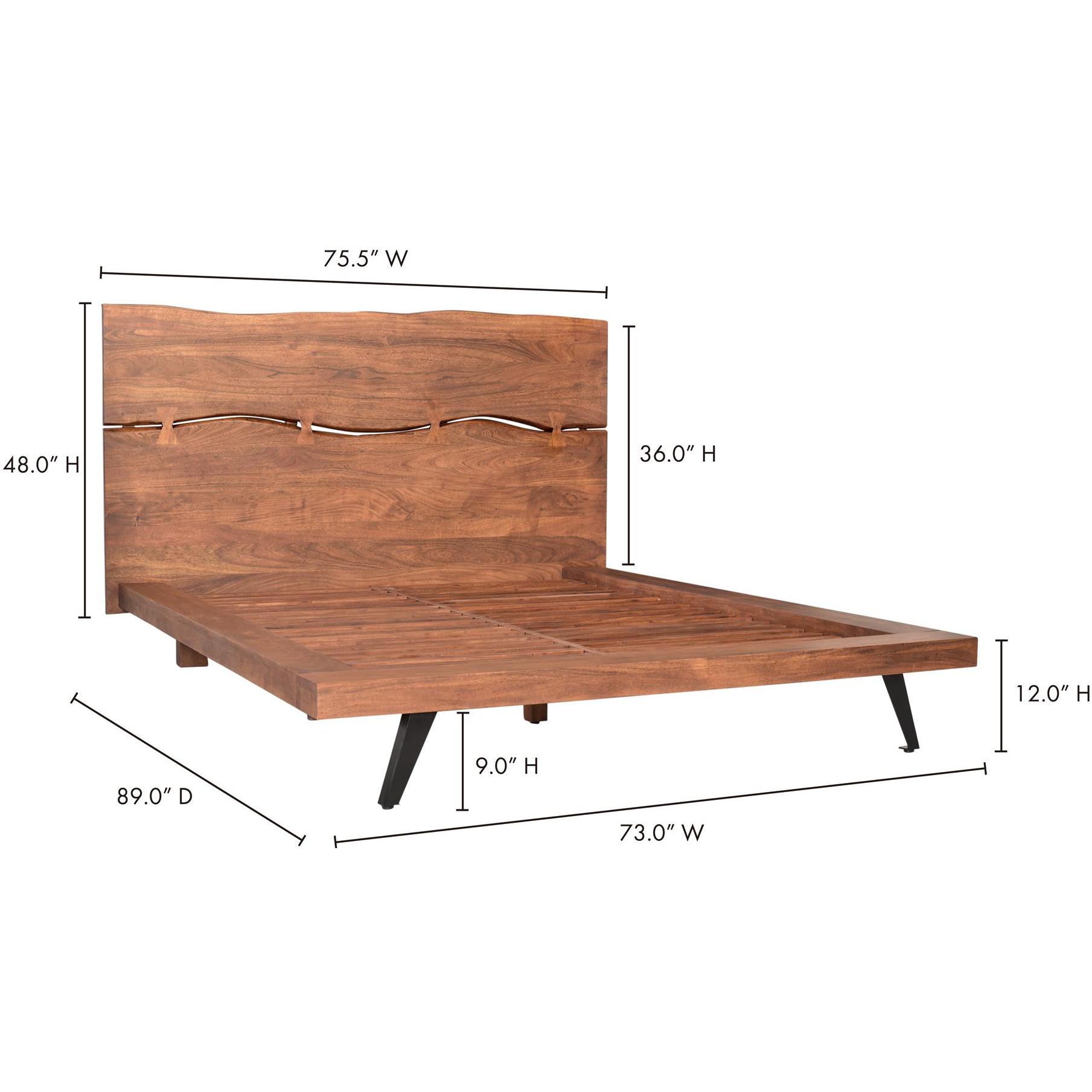 The Madagascar platform bed is a sublime fusion of nature’s tranquility and modern sophistication. Crafted from solid Acacia wood, this bed showcases a low platform design accentuated by an organic edge headboard, masterfully joined using the intricate butterfly woodworking technique with the entire bed supported by solid steel legs in a black powder-coated finish, elevating its rustic-industrial allure.