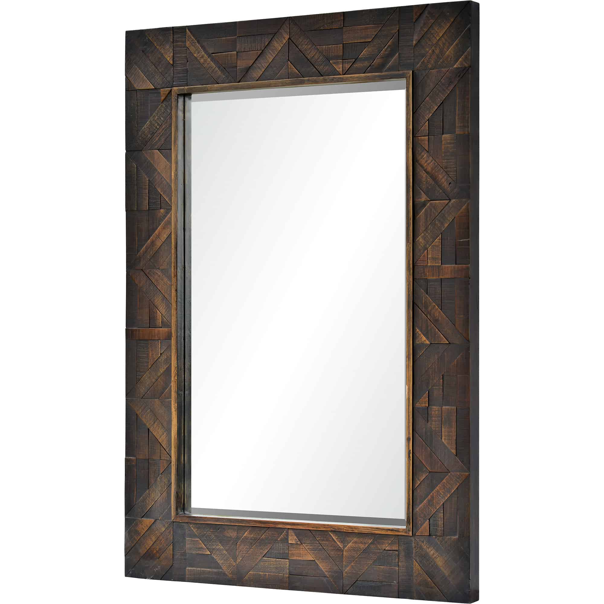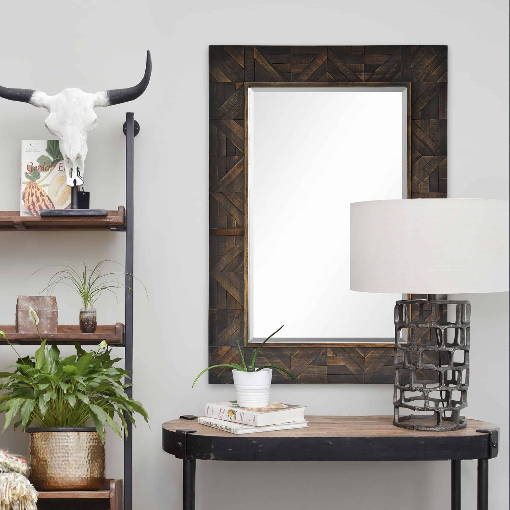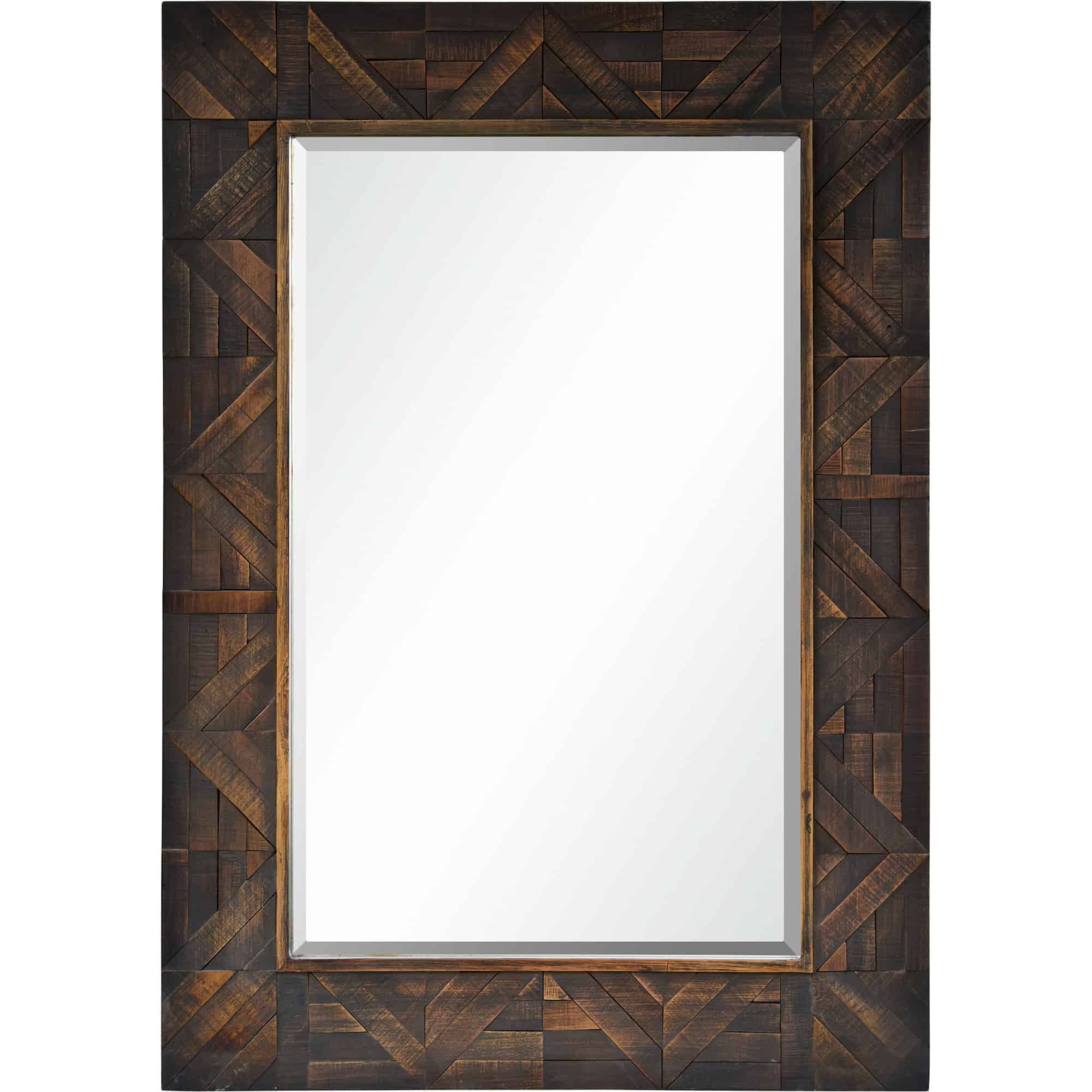 Cozy, rich and warm this wood framed mirror helps complete an inviting entryway design. Rustic yet traditional, it would be ideally suited for a space featuring bold, jewel tones.