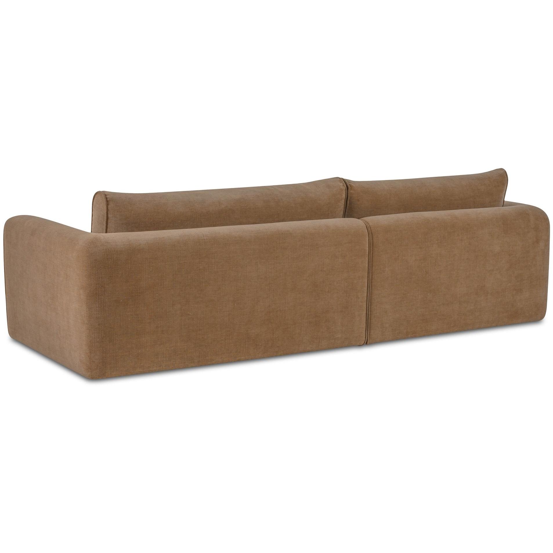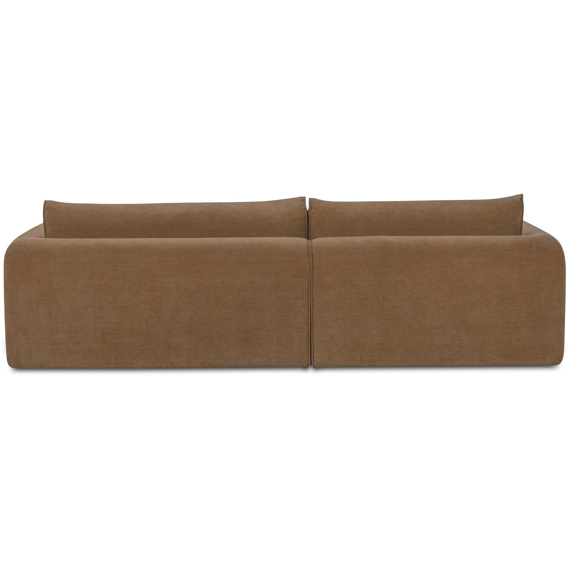The Madrid sectional’s soft fabric upholstery and unique, angled wide chaise make it unlike any other silhouette. Soft, with a railroad weave, it invites the touch, while tonal piping draws the eye. A soft fixed seat and plush removable, reversible back cushions ensure lasting comfort and versatility.