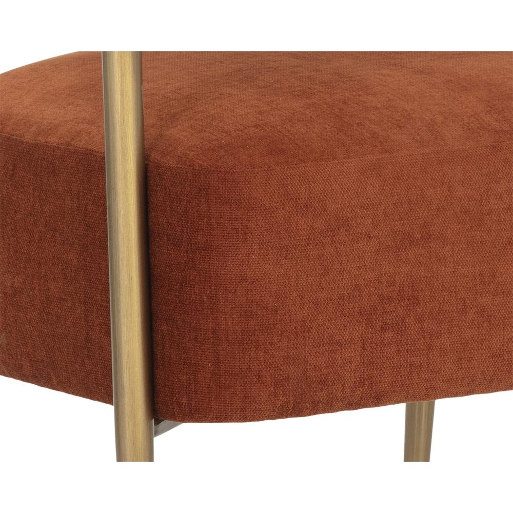Turn heads with this contemporary lounge chair that exudes extravagance. Features a curved frame and upholstered in our danny rust and navy fabrics. Completed with antique brass legs. Also available in dove cream fabric.