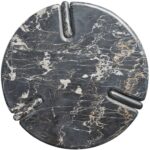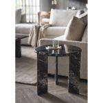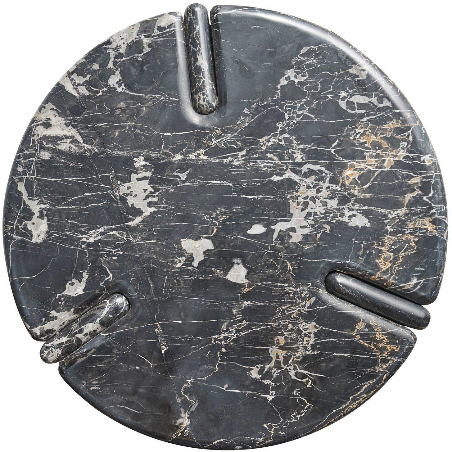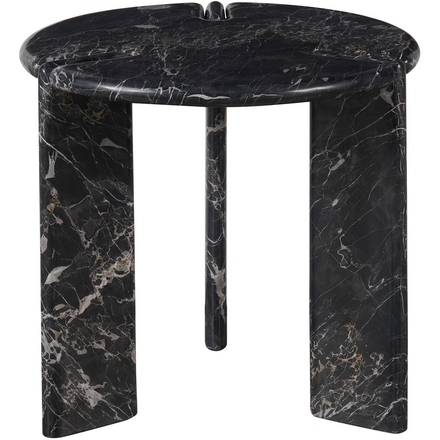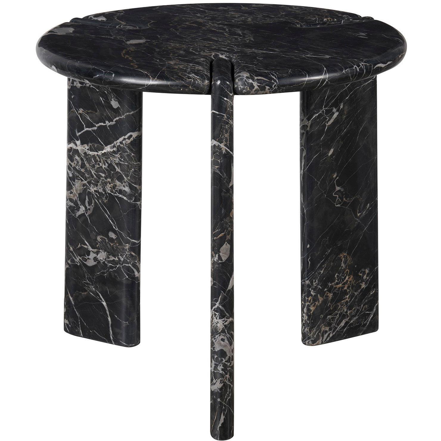 The Magnus End Table, crafted in deep black Golden Porter Marble, presents a striking circular silhouette with three slab-like legs, each connected by unique, intricate details. This robust and sleek design offers a commanding presence, blending luxurious materiality with an eye-catching play on form.