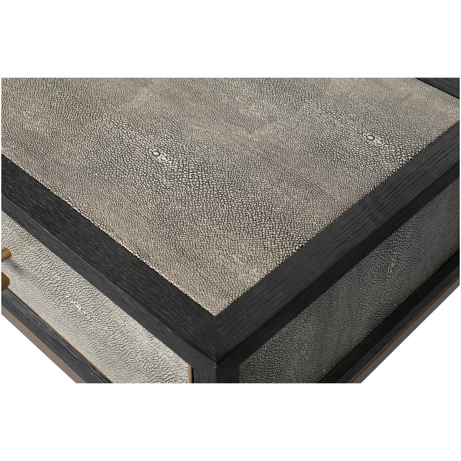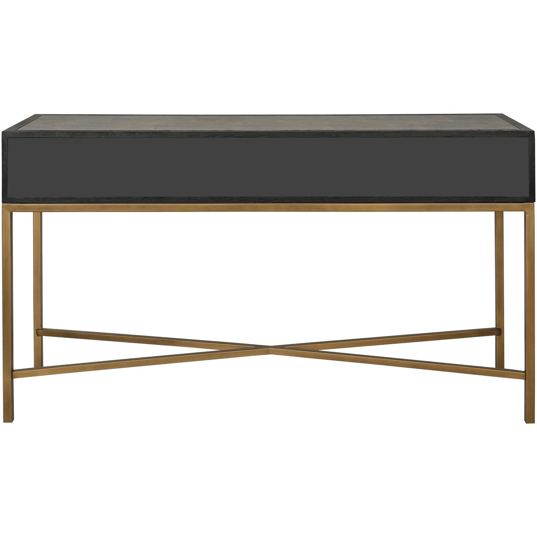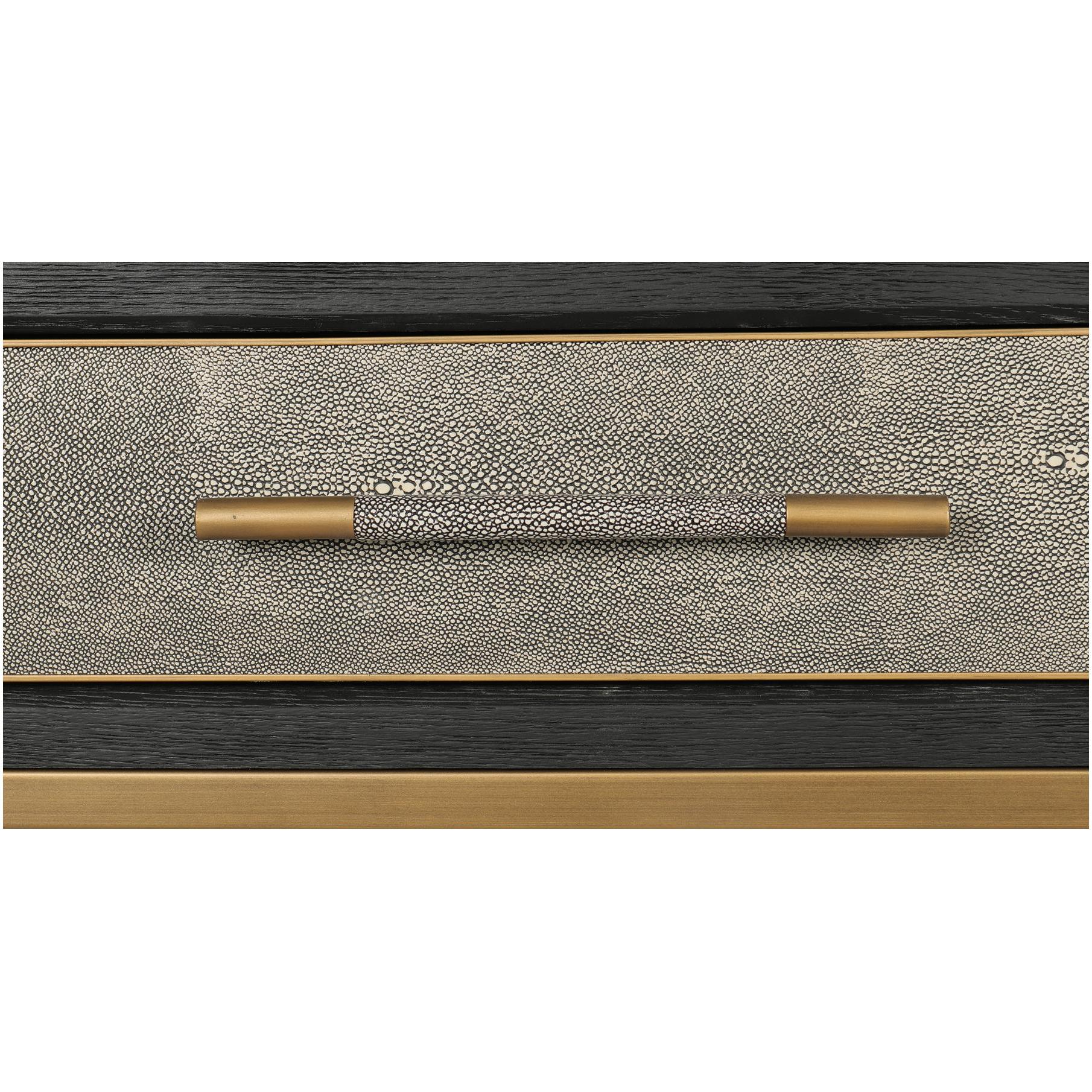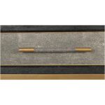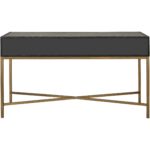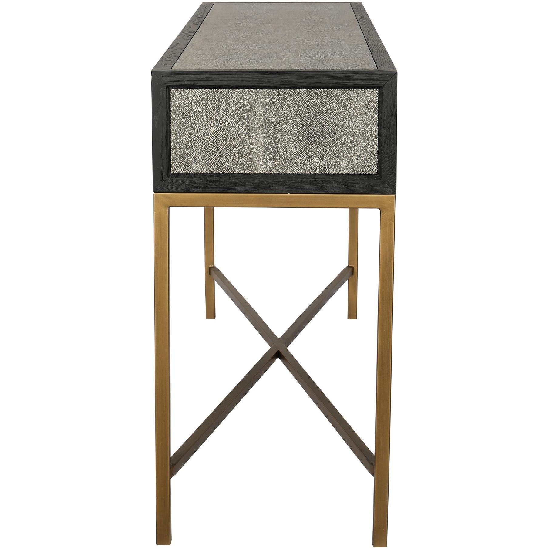 Texture, meet your new routine. The Mako console table brings Art Deco geometry to everyday living, adding a shagreen-style finish that plays with light without taking over. A solid black oak frame gives structure, wrapped in grey shagreen-patterned polyurethane for an easy-care vegan-leather look, then set on brass-finished legs for a warm contrast. The result feels calm but intentional—ready for keys, lamps, and whatever walks in next. Consider it your hallway’s reset button every day.