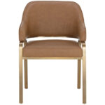 With a curved back and sleek gold stainless steel base, the Malachi Dining Armchair brings an air of modern elegance to any dining room. Upholstered in milliken cognac faux leather for durability and comfort.