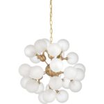 Contemporary gold and opaque globe cluster chandelier. Must use g9 led bulbs. Twenty seven lights. Comes with 8′ of chain