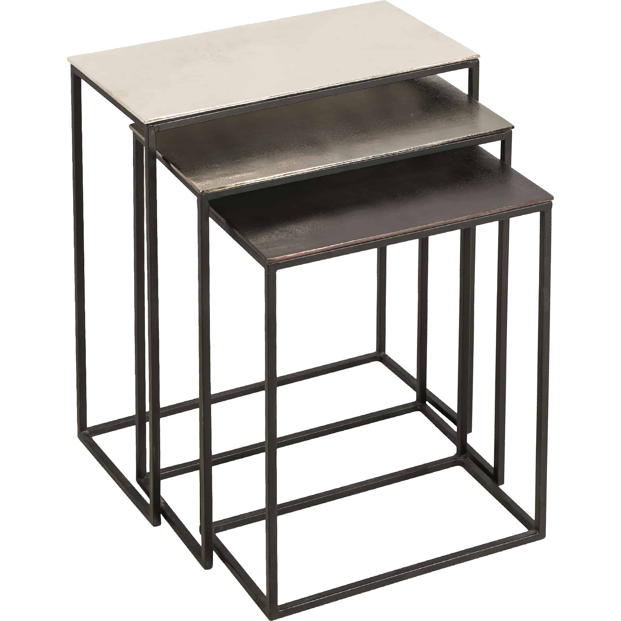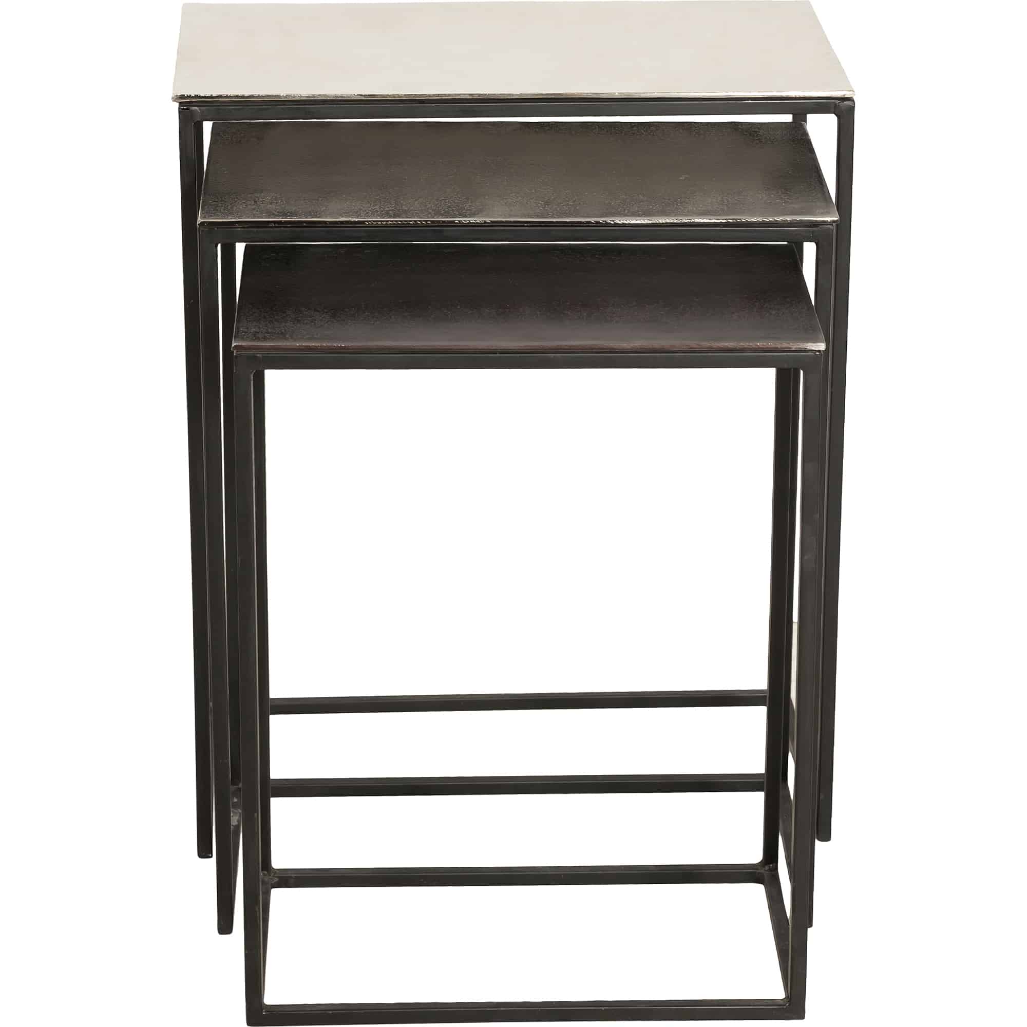The set of three nesting tables uses multiple metallic surfaces to define its distinctive style. The aluminum tabletops of the metal tables transition from silver to raw nickel to bronze in variegated shades that shimmer from every angle. Traditional by design, the small, medium and large accent tables fit together within the rectangular perimeter of their black iron frames.