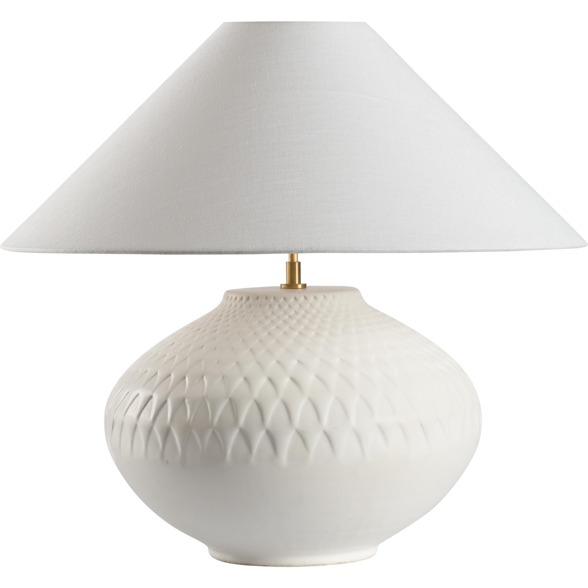 The Manzoni Lamp makes a bold, sculptural statement with its low, rounded form and dimensional surface pattern. Made in Italy from ceramic with a white matte glaze, it brings a grounded elegance and modern edge to any setting.
