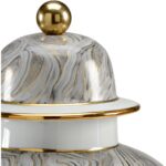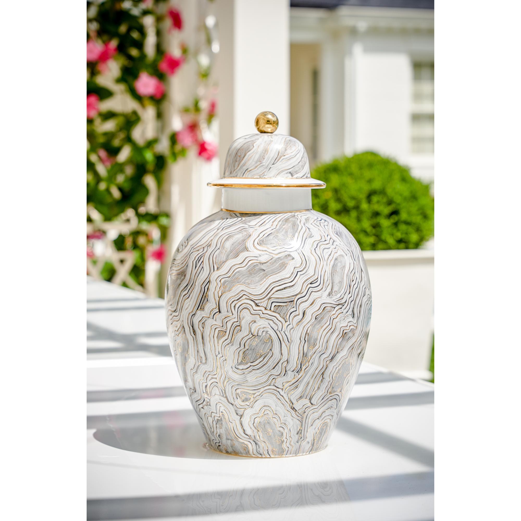 Be mesmerized by the modern design of this traditional covered urn. Crafted of white glazed porcelain for an enduring piece, this 19″ urn with removable top features a hand painted gray marbled pattern with metallic gold details. This eye catching accent can be displayed on credenzas, tabletops or mantels throughout your home.