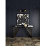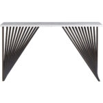 Ornament a hallway with the Marcel Console Table, a strongly angled statement piece featuring a smooth stone top set atop a bronze metal finished base.
