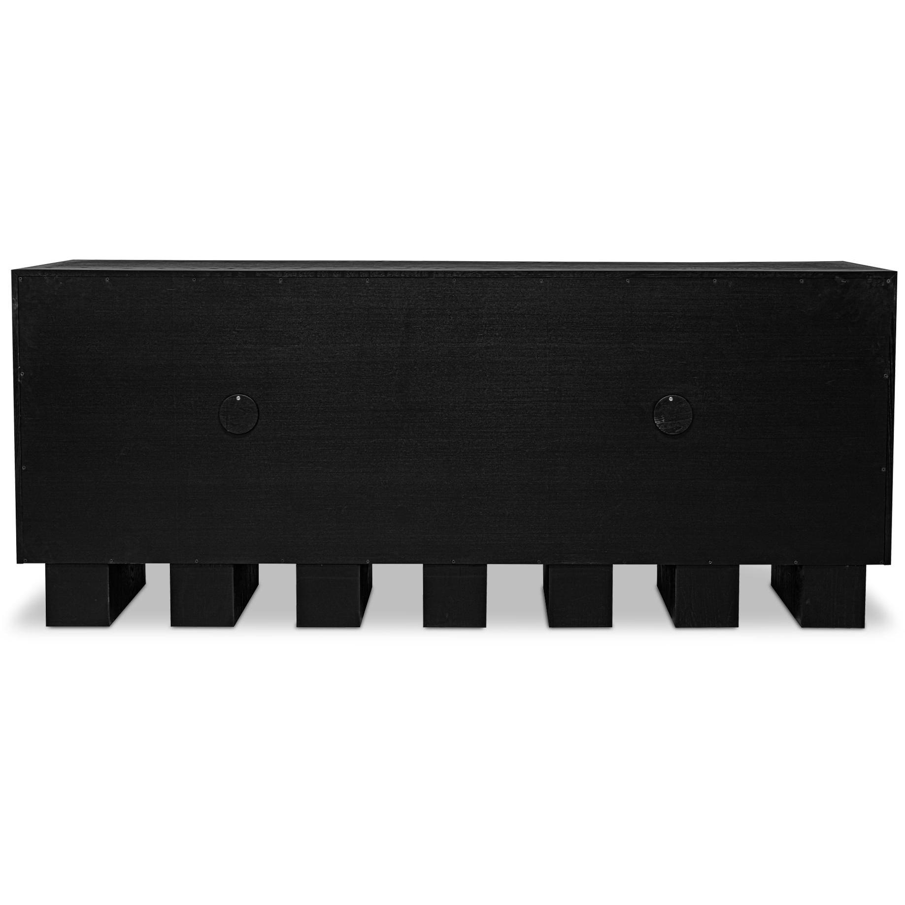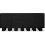 The Marcelle sideboard in black embodies minimalist elegance as playful, chunky legs enliven clean lines. Wire-brushed oak meets sleek black shagreen, framed by antique gold accents, creating a symphony of textures. Push-to-open doors reveal ample storage, while discreet media holes ensure seamless cable management.