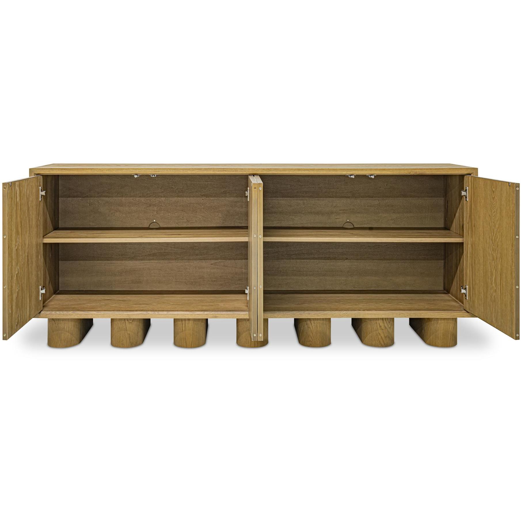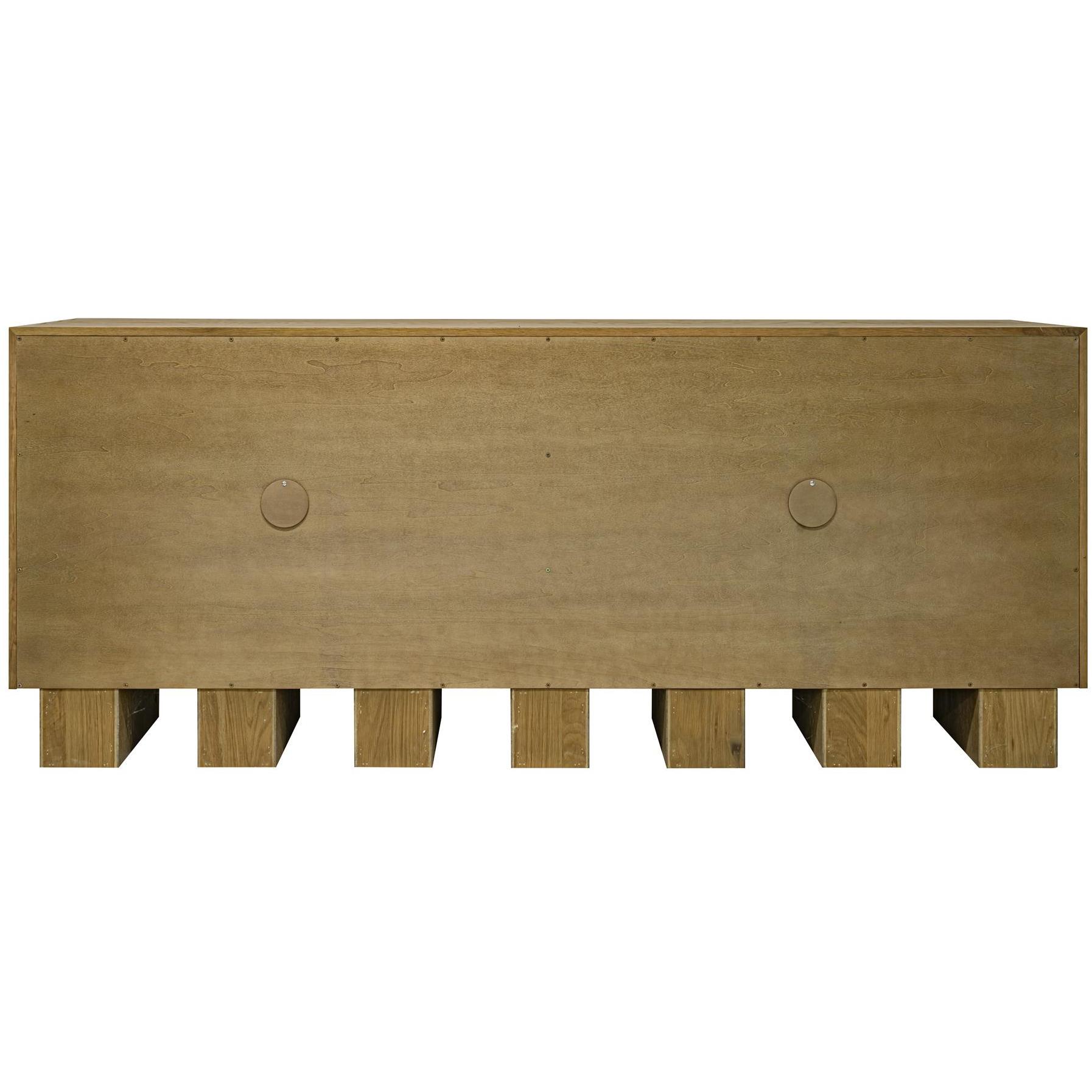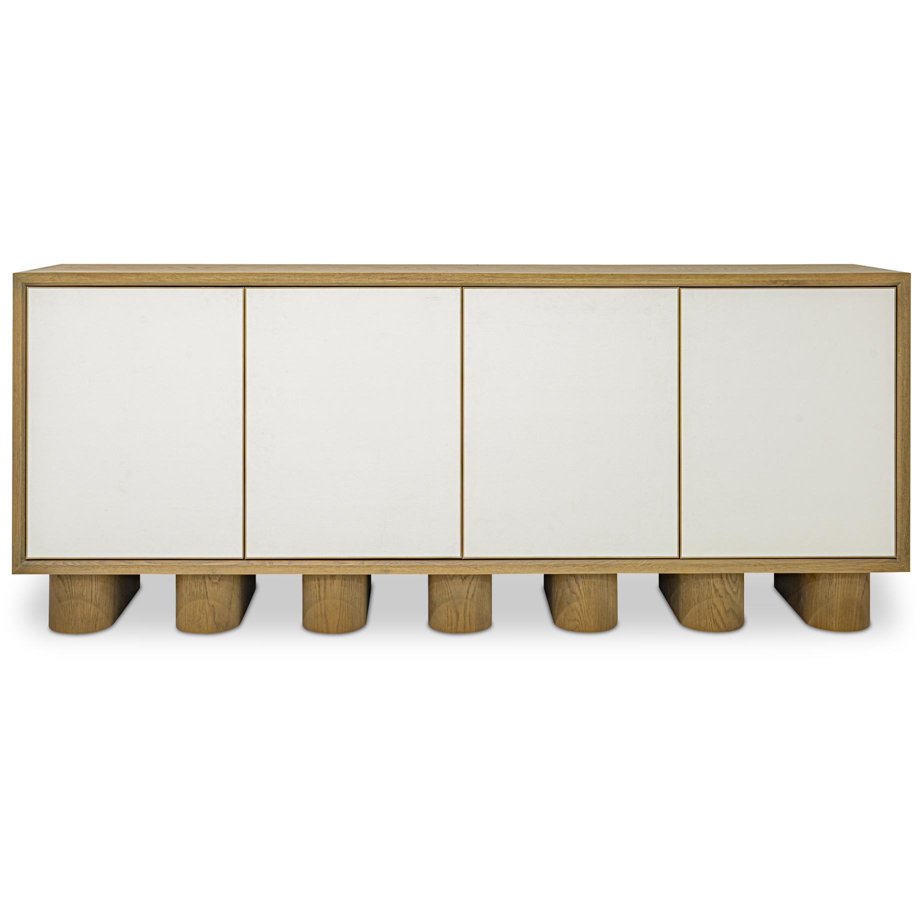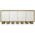 The Marcelle sideboard in white embodies minimalist elegance as playful, chunky legs enliven clean lines. Wire-brushed oak meets sleek shagreen, framed by antique gold accents, creating a symphony of textures. Push-to-open doors reveal ample storage, while discreet media holes ensure seamless cable management.