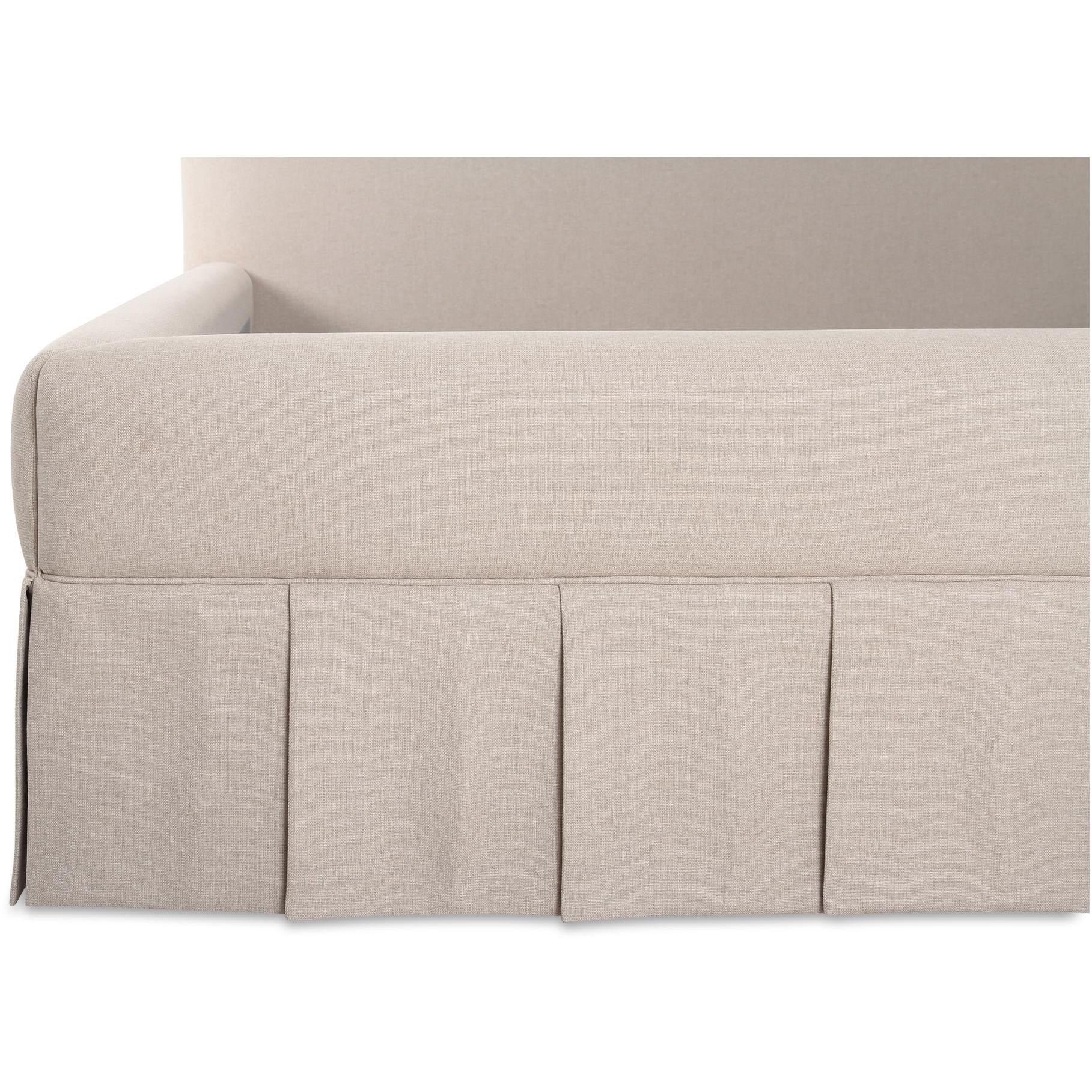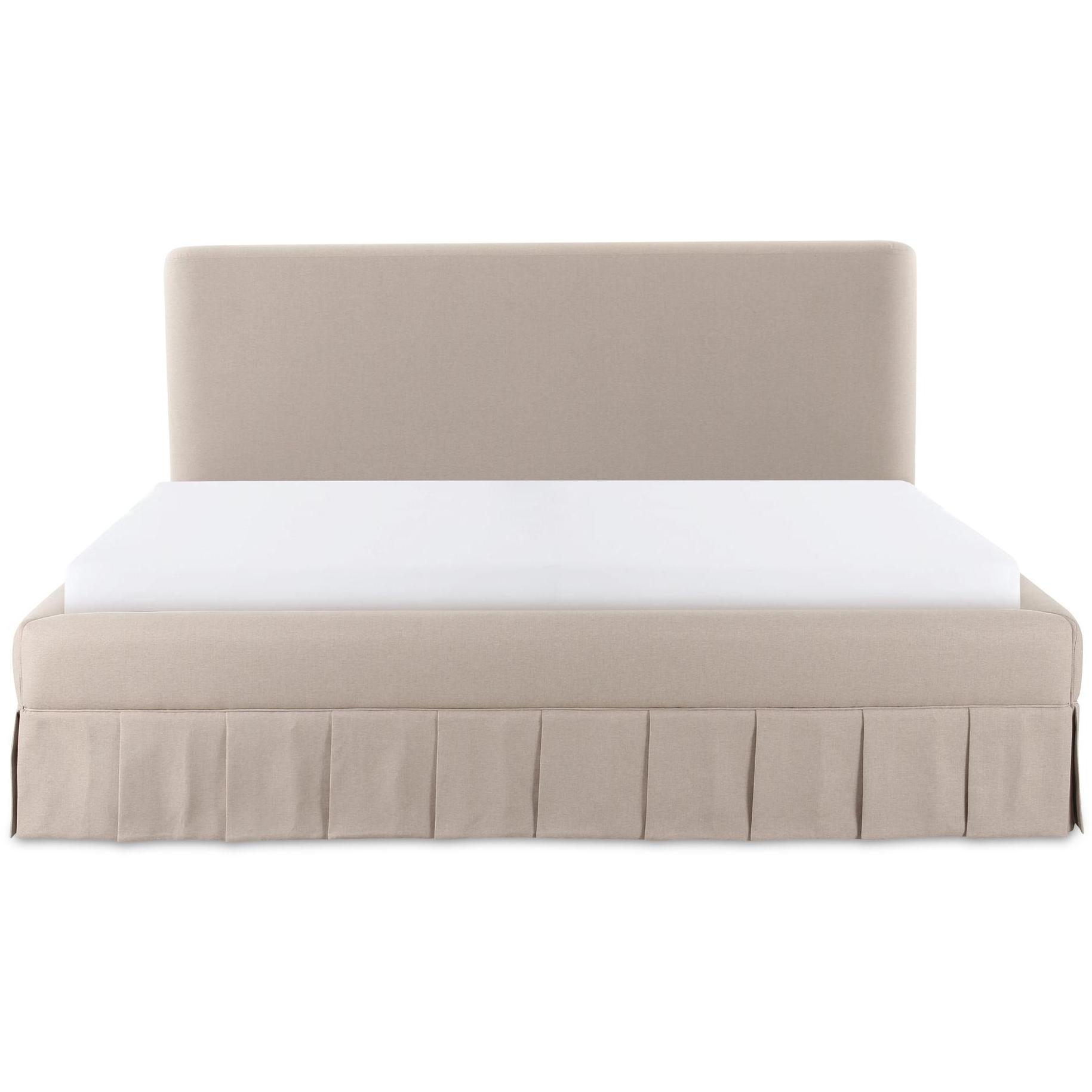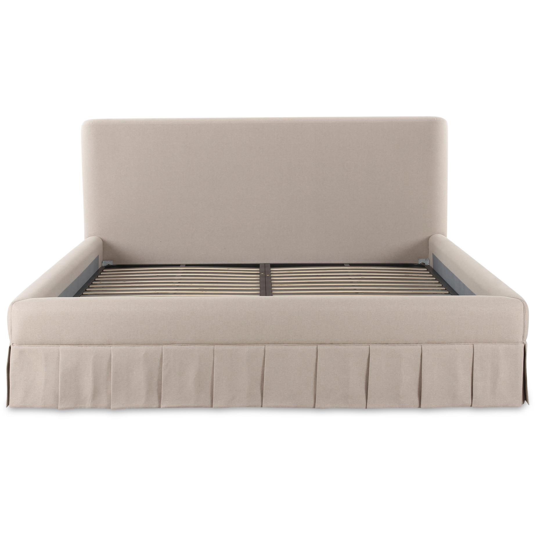 The Maren king bed exudes a soft, feminine aesthetic, upholstered in a warm, neutral fabric and featuring a playful yet refined box pleat base reminiscent of vintage finesse, straddling the line between contemporary form and traditional finish. With smoothly rounded corners and graceful, curving forms adding softness to the design, this piece is a study in elegance and subtlety.