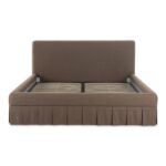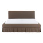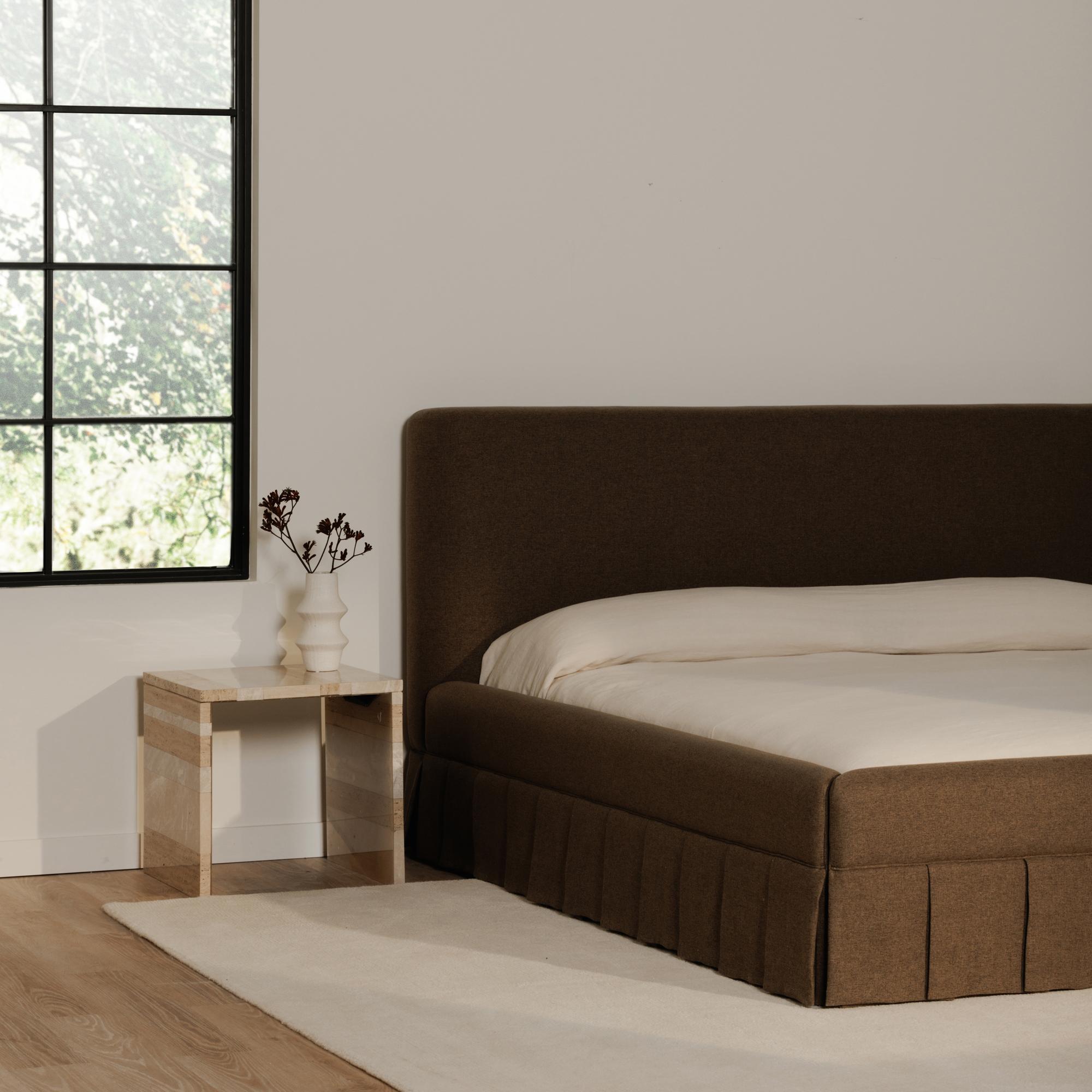 The Maren king bed exudes a soft, feminine aesthetic, upholstered in a warm, neutral fabric and featuring a playful yet refined box pleat base reminiscent of vintage finesse, straddling the line between contemporary form and traditional finish. With smoothly rounded corners and graceful, curving forms adding softness to the design, this piece is a study in elegance and subtlety.