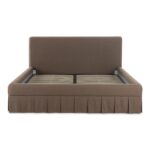 The Maren queen bed exudes a soft, feminine aesthetic, upholstered in a warm, neutral fabric and featuring a playful yet refined box pleat base reminiscent of vintage finesse, straddling the line between contemporary form and traditional finish. With smoothly rounded corners and graceful, curving forms adding softness to the design, this piece is a study in elegance and subtlety.