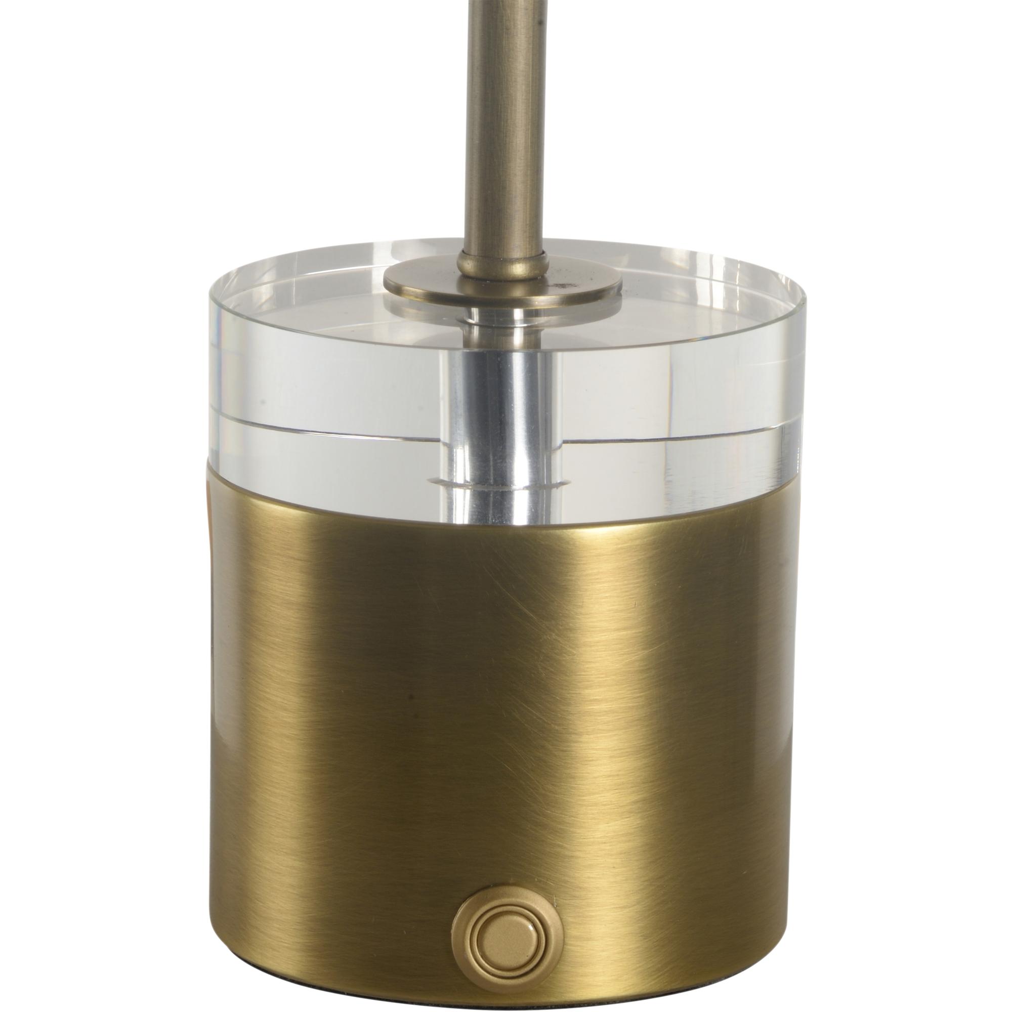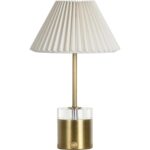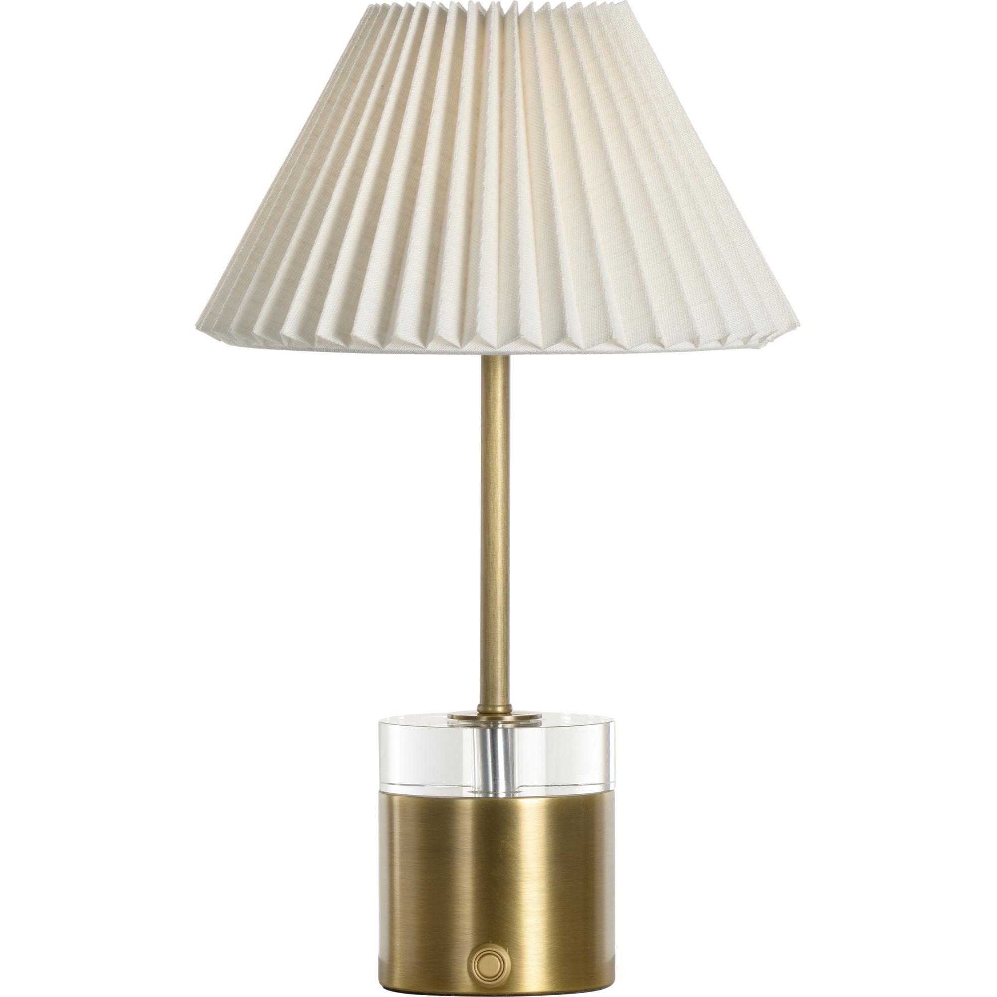 The Margot Battery Lamp is a stylish and functional lighting piece, perfect for any setting where flexibility and elegance are key. Featuring a dimmable LED light, this lamp allows you to adjust the brightness to suit your mood and needs. The rechargeable battery ensures convenience and portability, making it easy to place anywhere without the hassle of cords. The lamp’s design combines a sleek brass base with a clear acrylic accent, adding a modern touch, while the pleated shade softens the light for a warm, inviting glow. (2700 kelvin)