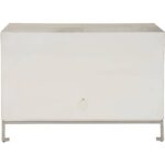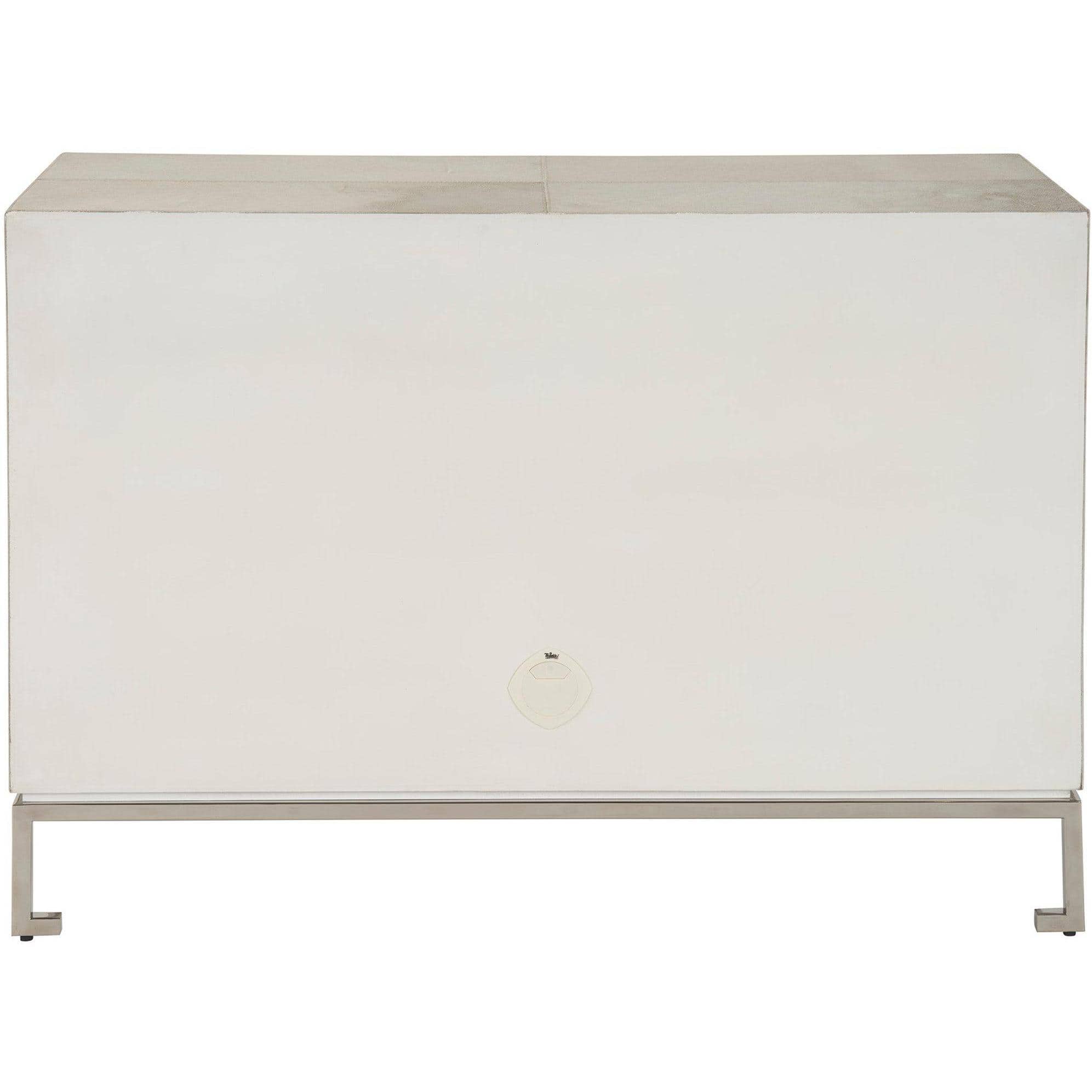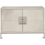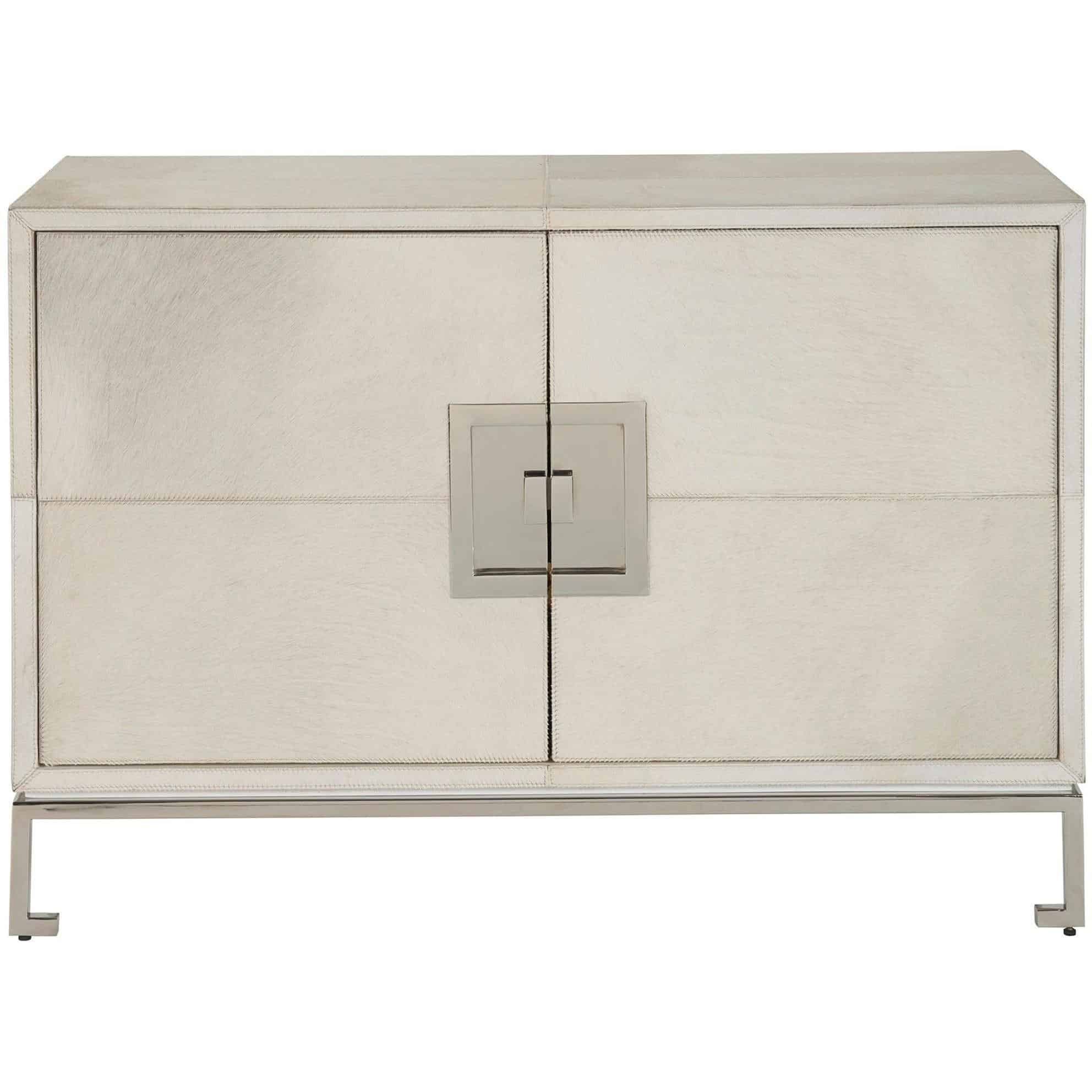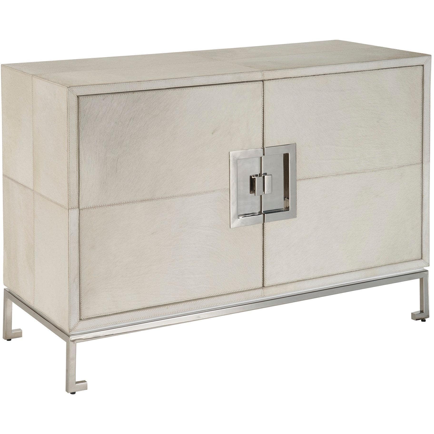 The Marigold Door Cabinet, enveloped in Grey Hair on Hide and accented with Polished Nickel, exudes an air of opulence and grace. Its design is enhanced by subtle geometric details, adding an element of sophistication that elevates this piece to a level of refined luxury, perfect for spaces that embrace a touch of glamour.
