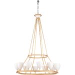 Showcasing luxurious elegance, marilyn chandelier features a modern wagon wheel silhouette with an warm antique gold leaf finish. Twelve upward facing sockets are encased in adjustable white ceramic shades that create a soft halo of light. Designed by larry laslo for use in foyers, lobbies or dining areas in either residential or commercial applications.