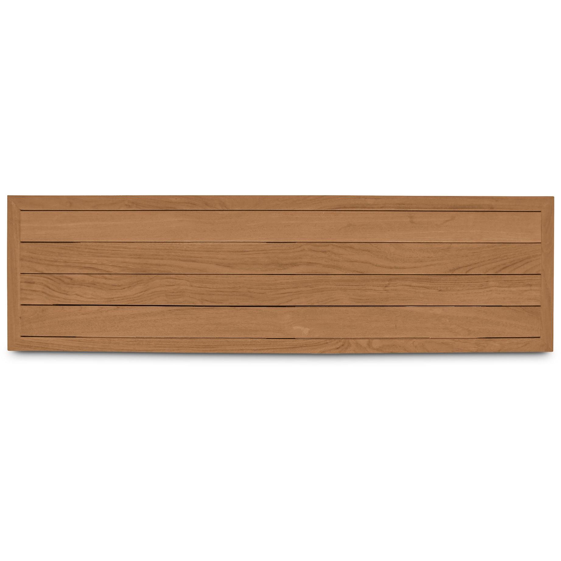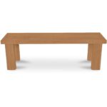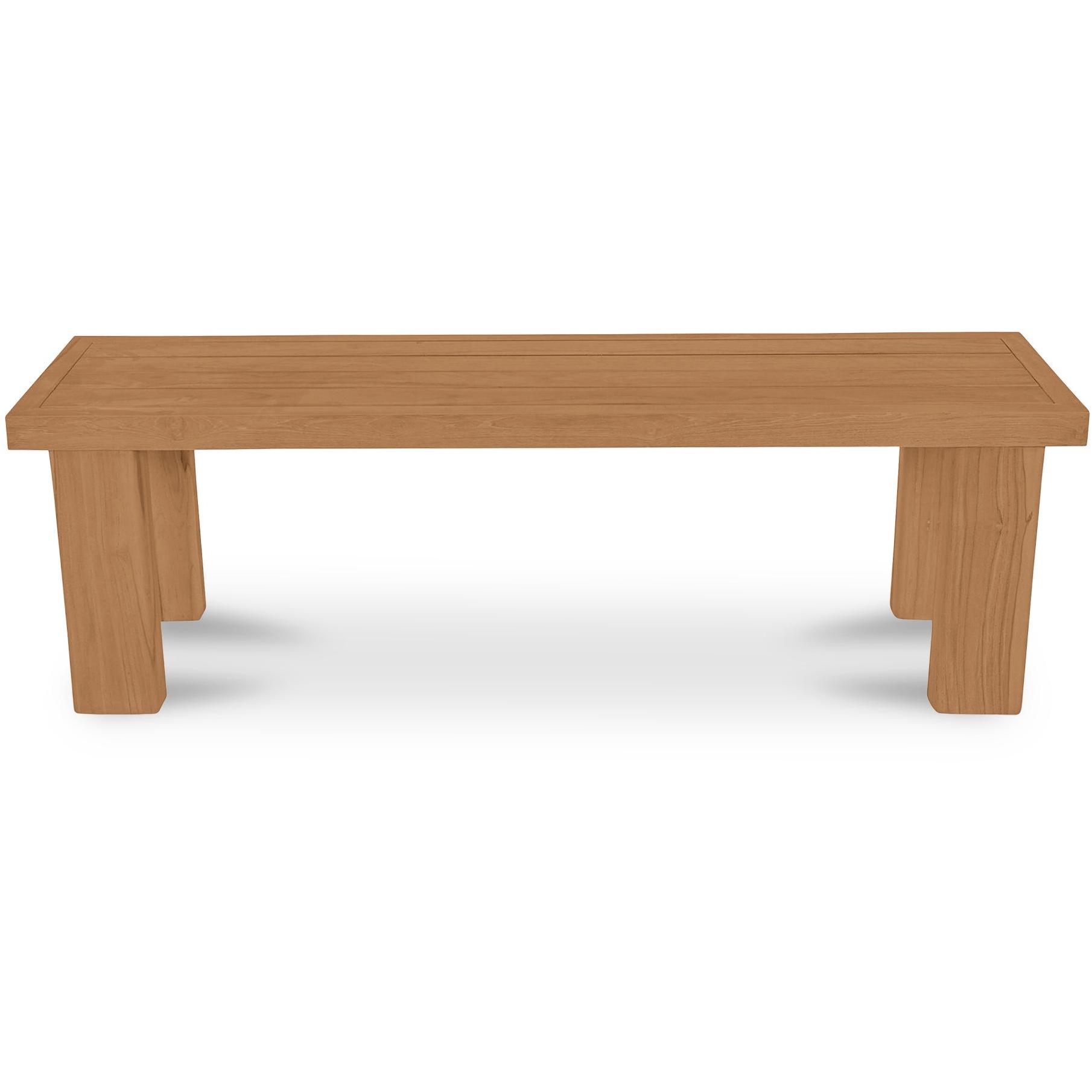 The Marina outdoor bench complements outdoor dining with refined simplicity. This modern slatted bench, crafted from solid teak with a natural finish, matches the silhouette of the Marina dining table. Its clean lines and durable construction make it a versatile seating option for the patio, garden, or poolside area, adding a touch of sophistication to the outdoor space.