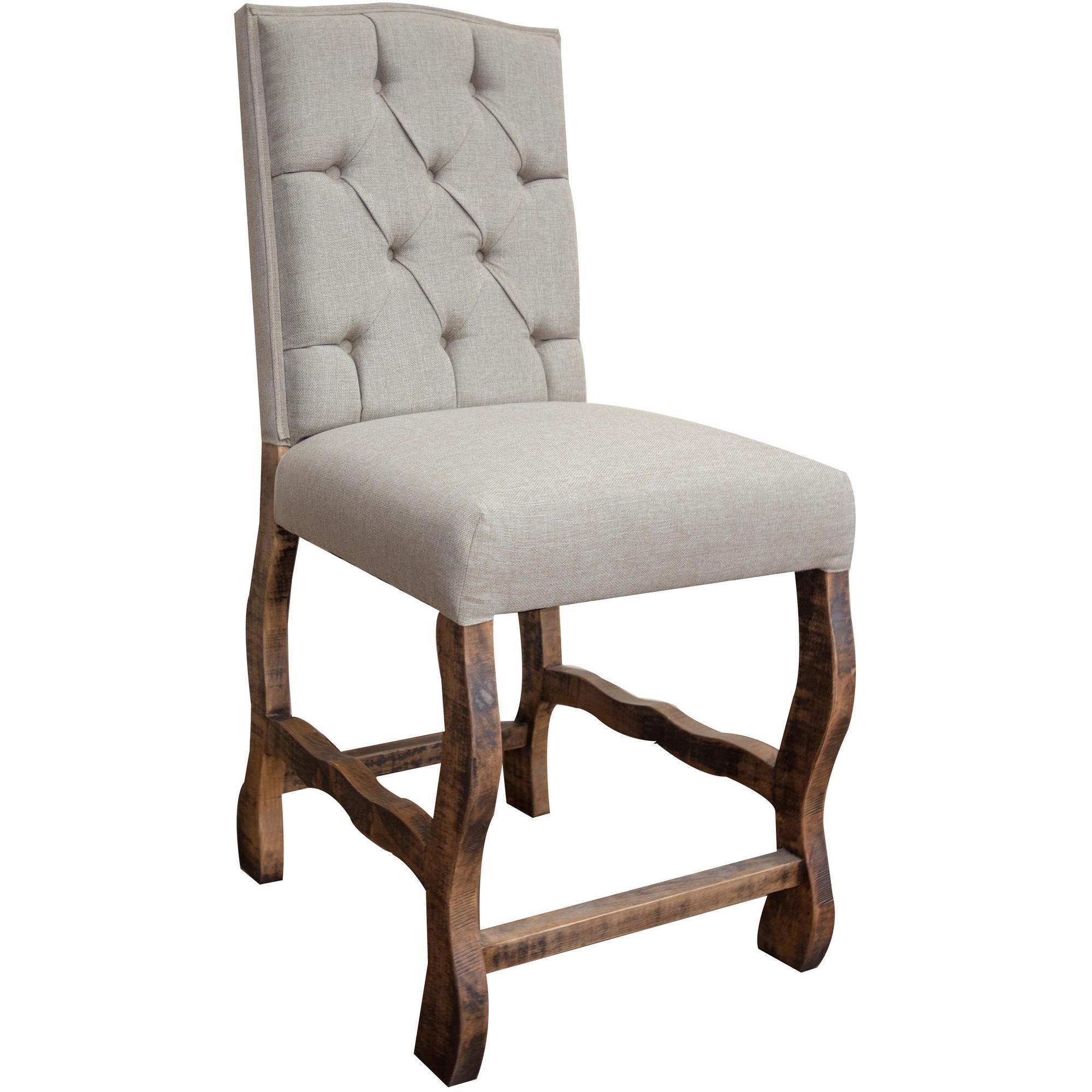 Inspired by farmhouse style, our Marquez upholstered barstool is designed to complement your space, adding a classic touch. It features a tufted backrest, and its frame is crafted from solid pine wood, making it a sturdy piece of furniture