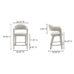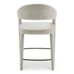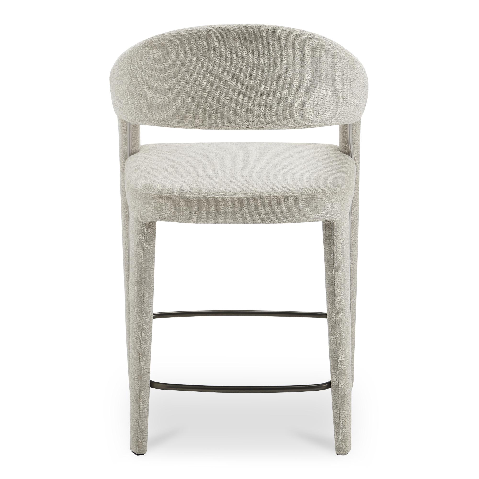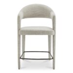 Soft landing, clean lines—Martens does both. Martens keeps the room feeling open with an airy barrel back and a smooth curve from leg to frame. Integrated arms add a more grounded posture, while generous padding makes lingering at the island feel effortless. A slim metal frame keeps lines clean, and the seat is built with plywood support and foam comfort. Upholstered in beige performance fabric, it’s crisp, comfortable, and composed all day at the counter, always.
