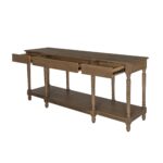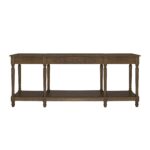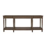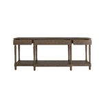 Meticulously crafted from solid oak with a rich brown finish, the Martha console table’s graceful silhouette features an alluring overhang and expertly turned legs. A subtly protruding middle drawer adds dimensional intrigue, while three drawers and an open shelf offer discreet storage.