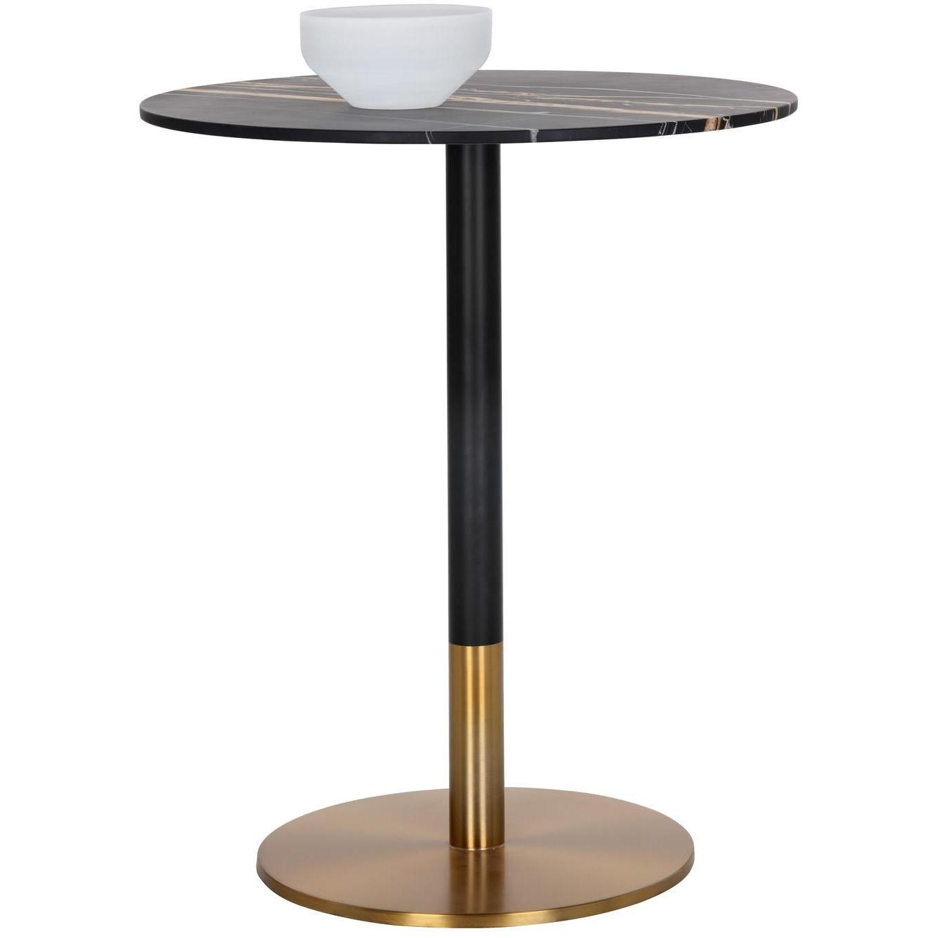 A round bar table inspired by Art Deco luxury. Features a matte black marble top with striking gold and white veining and a black and gold steel base. Perfect for small kitchen and dining spaces. As marble is a natural material, unique veining, pitting, fissures, micro-cracks and colour variations are all characteristics that add to the uniqueness and beauty of each piece.