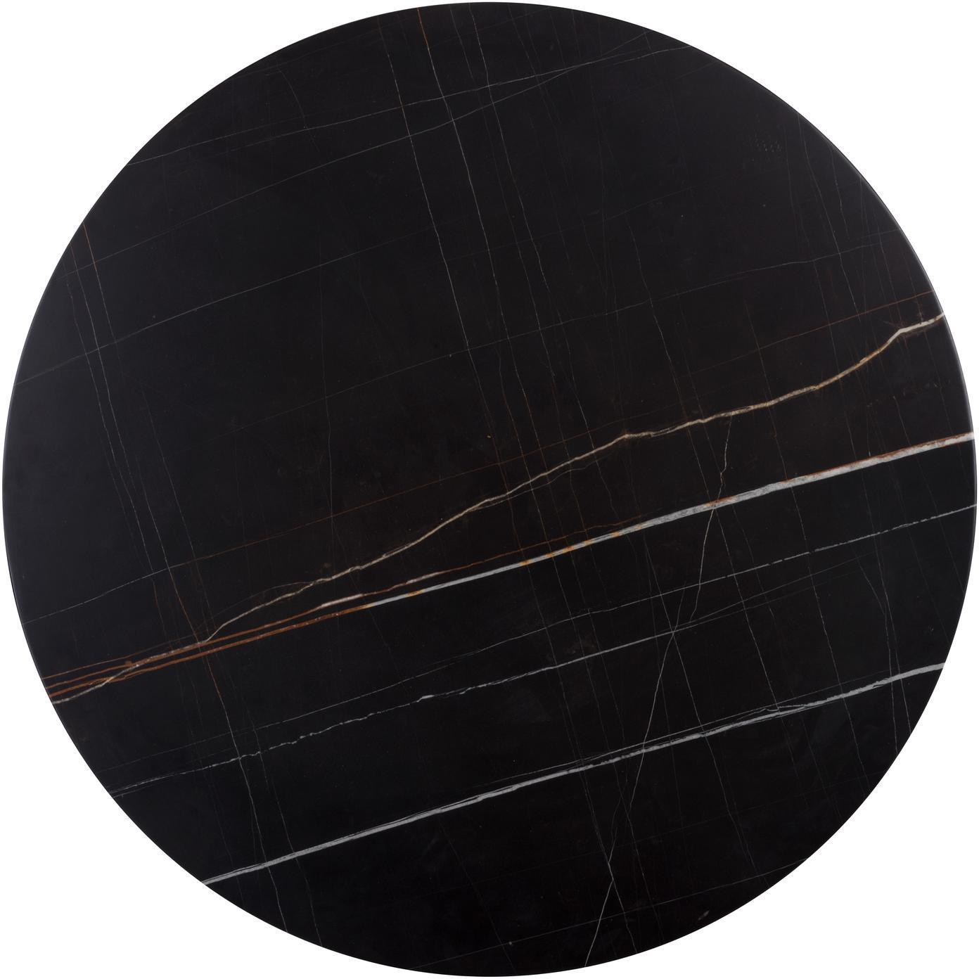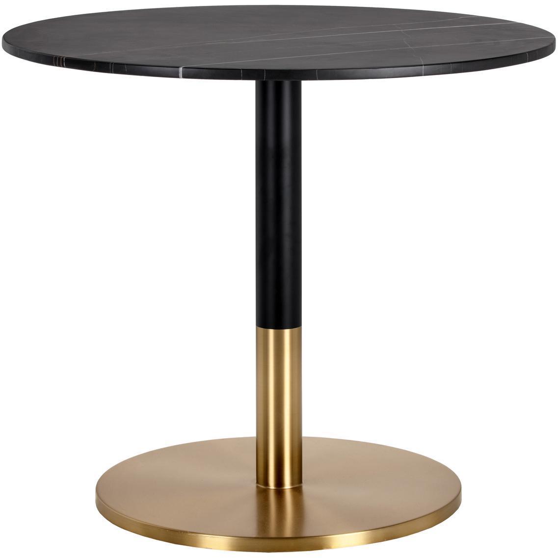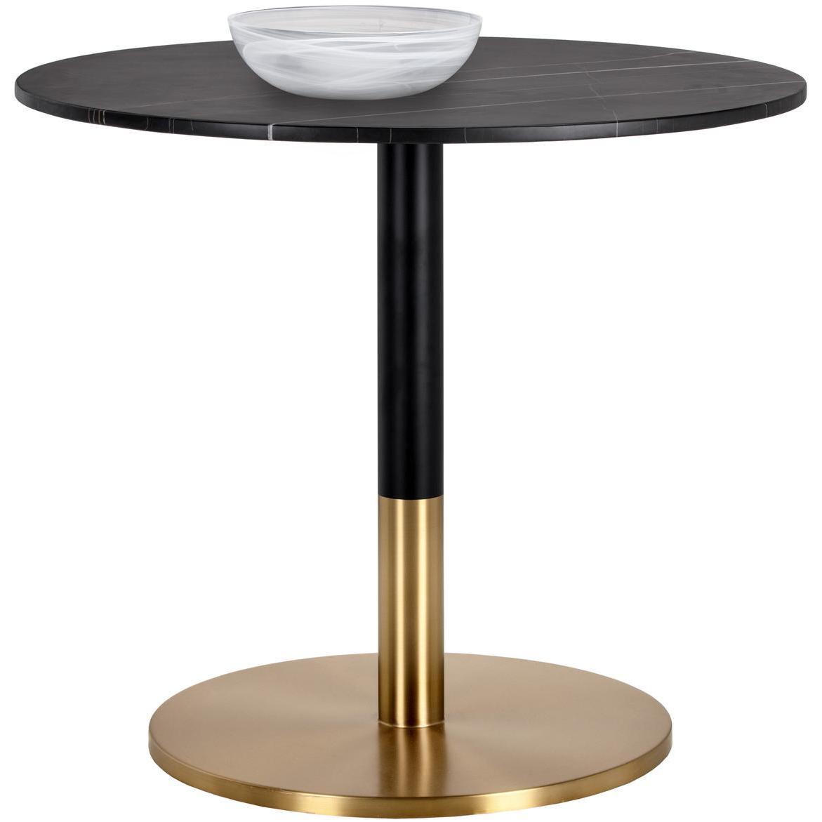 A round bistro table inspired by Art Deco luxury. Features a matte black marble top with striking gold and white veining and a black and gold steel base. Perfect for small kitchen and dining spaces. As marble is a natural material, unique veining, pitting, fissures, micro-cracks and colour variations are all characteristics that add to the uniqueness and beauty of each piece.